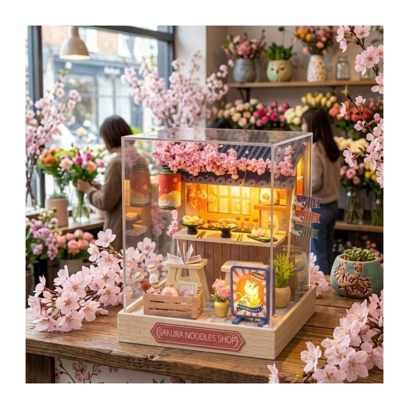 Ce kit installe l'ambiance chaleureuse d'un petit restaurant chinois sous des cerisiers en fleurs. Lanternes, bols de ramen et etageres decoratives recreent une scene vivante et apaisante.