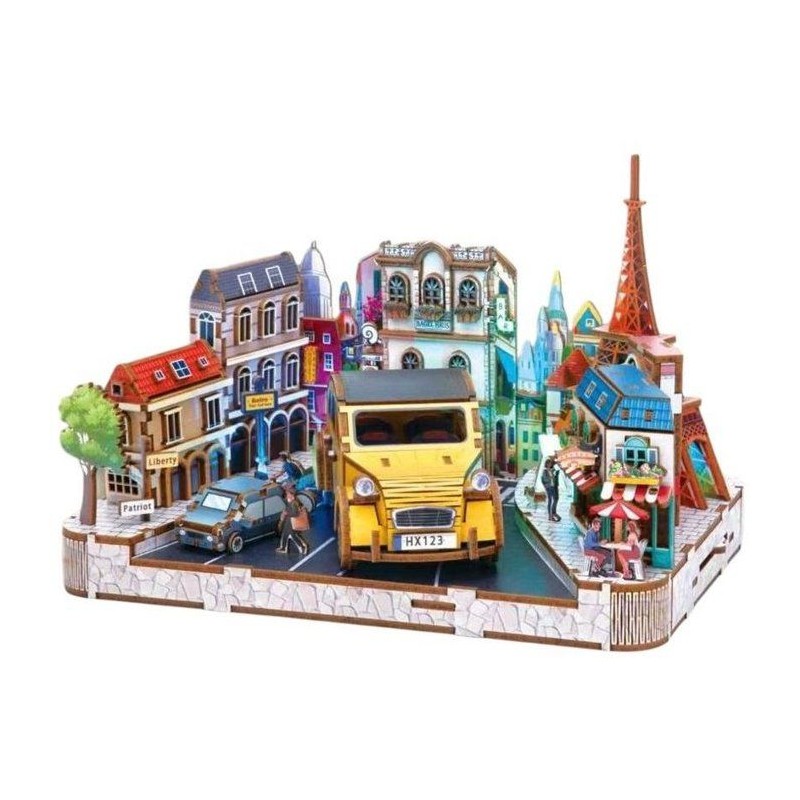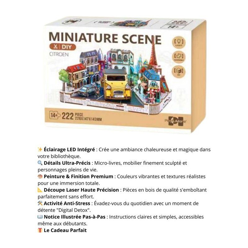 Une scene miniature des rues de Paris avec la Tour Eiffel en arriere-plan, une voiture francaise ancienne sur les paves et des facades typiques aux balcons fleuris.