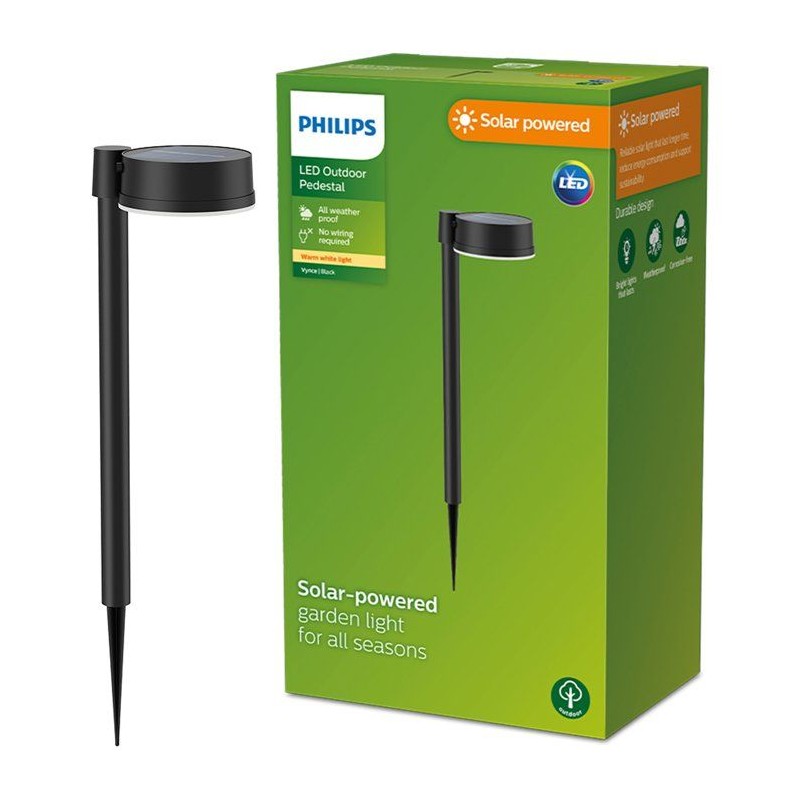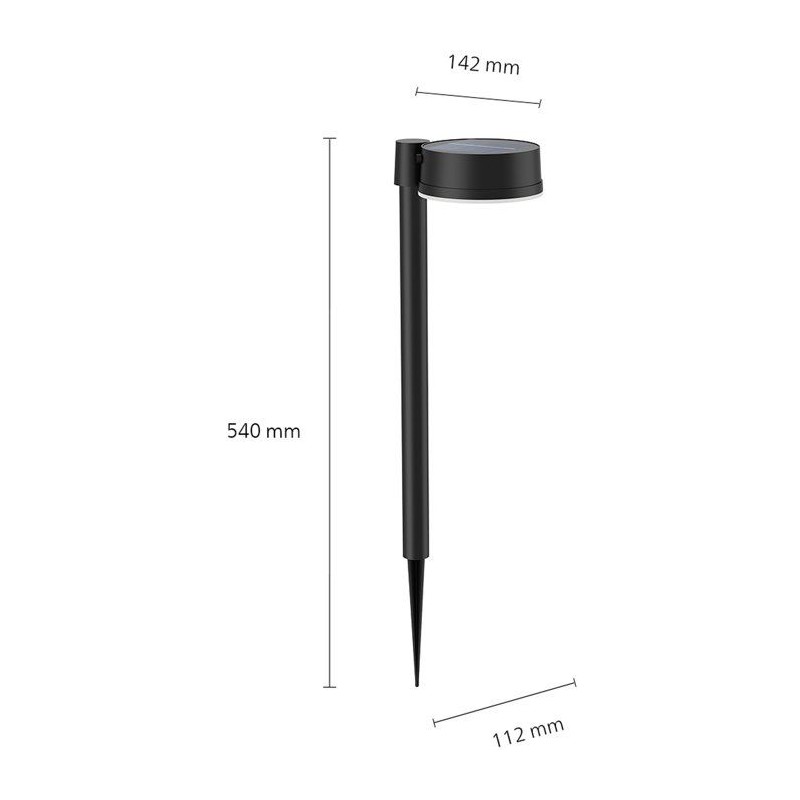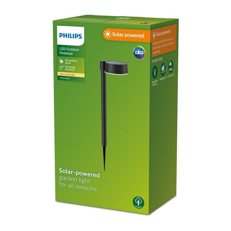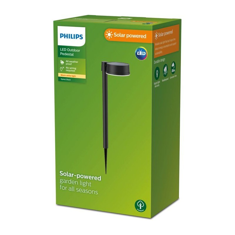 La borne lumineuse sur broche Philips Vynce est une lampe solaire fiable et durable conçue pour consommer moins d'énergie, idéale pour un mode de vie plus respectueux de l'environnement. Grâce a son panneau solaire intégré, elle ne nécessite aucun branchement électrique et peut etre installée facilement n'importe où dans le jardin. Sa broche permet une fixation simple dans le sol, offrant une grande liberté d'aménagement sans contrainte de câblage, meme si vous souhaitez réorganiser votre espace extérieur.