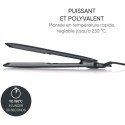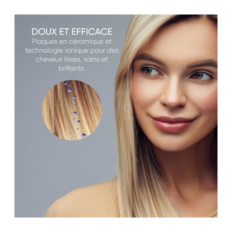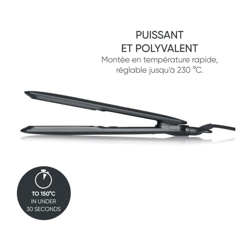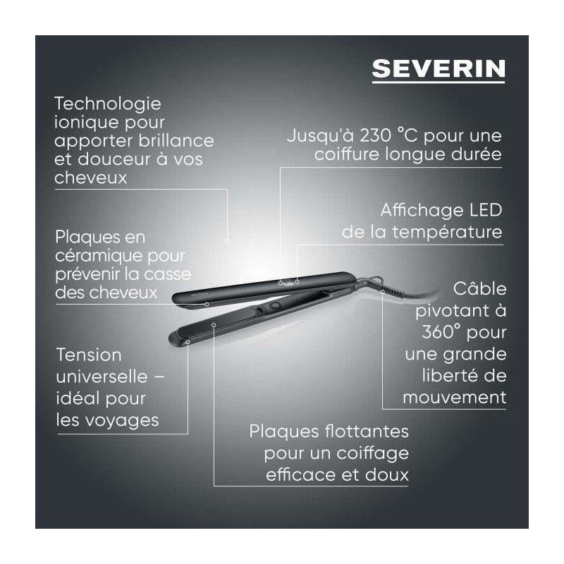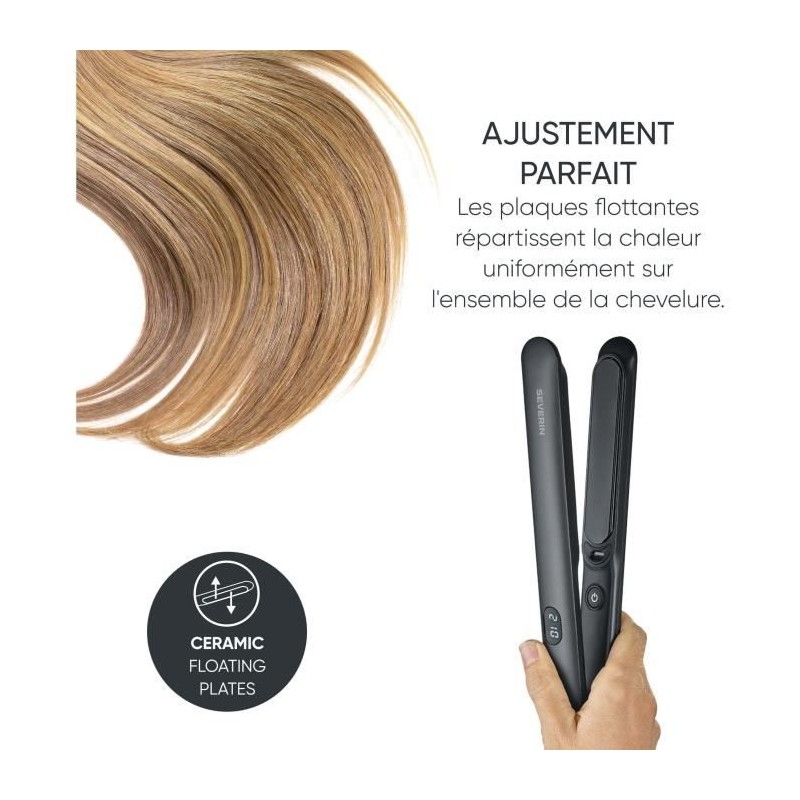 Lisseur Professionnel SEVERIN HG 0622 : Céramique, Ions & Haute Précision . Obtenez un lissage impeccable et une brillance miroir avec le lisseur SEVERIN HG 0622. Conçu pour allier protection du cheveu et efficacité professionnelle, ce fer a lisser s'adapte a toutes les natures de cheveux grâce a sa plage de température étendue. Plaques Flottantes en Céramique & Technologie Ionique : Fini les passages répétés ! Les plaques flottantes en céramique (24,5 x 110 mm) assurent une glisse ultra-douce et une répartition uniforme de la chaleur. Couplée a la technologie ionique, cette innovation réduit les frisottis et l'électricité statique pour un fini soyeux. Chauffe Ultra-Rapide et Contrôle LED : Gagnez du temps : grâce a l'élément chauffant PTC, l'appareil atteint 150 °C en seulement 30 secondes. L'écran LED intuitif permet de moduler la température de 130 °C a 230 °C pour un coiffage sur mesure et respectueux de votre sensibilité capillaire. Confort d'Utilisation et Design Nomade : Idéal pour les déplacements, ce lisseur bi-tension (100-240 V) vous accompagne partout dans le monde. Son ergonomie est pensée pour une liberté totale : - Cordon professionnel de 280 cm : Un rayon d'action maximal. - Câble rotatif a 360° : Évite les noeuds et facilite la manipulation (lissage ou ondulations). - Anneau de suspension : Pour un rangement simple et sécurisé. L'Excellence de la Qualité Allemande : Performant et durable, le lisseur SEVERIN est garanti 2 ans, vous offrant la sérénité d'un investissement fiable pour votre routine beauté.