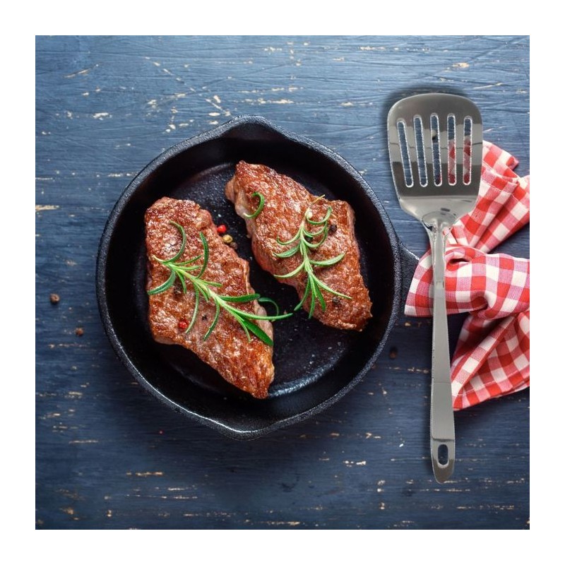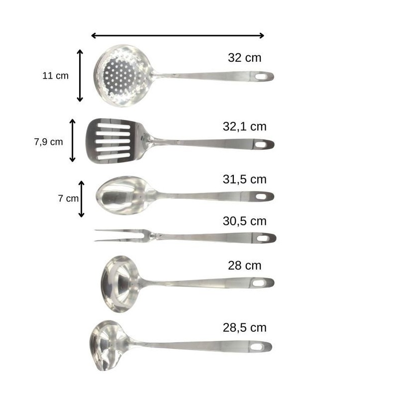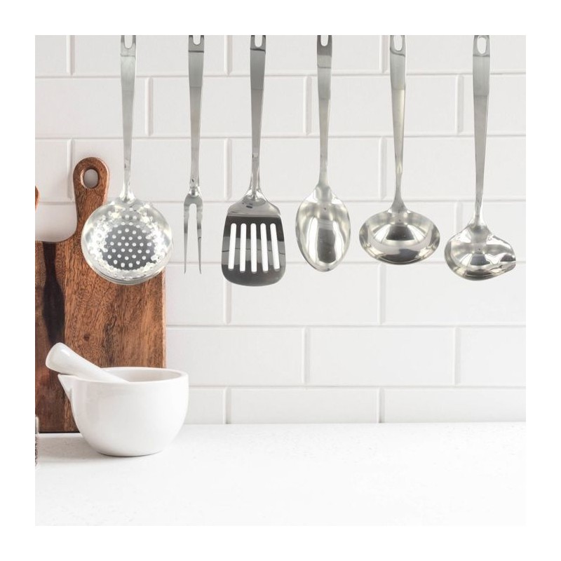 Ensemble d'ustensiles de cuisine de 6 pieces Fackelmann Oxford en acier inoxydable, simples et efficaces ces accessoires deviendront vos meilleurs alliés. LE PETIT + : les crochets situés en bout de manche vous donnent la possibilité de suspendre vos accessoires ou de les accrocher dans votre cuisine afin de les retrouver facilement. COMPOSITION et ENTRETIEN : Acier inoxydable | Les produits passent au lave-vaisselle. DIMENSIONS : De 28 a 32 cm CONTENU : 1 écumoire + 1 fourchette a viande + 1 pelle a servir + 1 cuillere a servir + 1 louche + 1 cuillere a sauce Fackelmann France propose cet ensemble de 6   ustensiles de cuisine en acier inoxydable , simplifiez vous la vie grâce a nos outils et accessoires de cuisine. Préparez vos repas ou meme vos pâtisseries préférées grâce a ce set complet pour votre cuisine. Ne cherchez plus, tout est inclus: écumoire, pelle a servir, louche, cuillere a servir et cuillere spéciale pour sauces et meme une fourchette a viande pour vos délicieuses côtes de boeuf. Fackelmann France est une entreprise spécialisée dans la distribution d'ustensiles de cuisine et de pâtisserie ainsi que de moules a gâteaux et de plaques de cuisson. L'entreprise tente d'apporter une certaine facilité dans la façon de cuisiner de chacun grâce a ses ustensiles malins. Les ustensiles de cuisine de Fackelmann France sont proposés a tous les profils de cuisiniers pour une utilisation simple et quotidienne. Les fouets, spatules, louches, éplucheurs, planches a découper et bien d'autres sont a votre portée afin de préparer de délicieuses recettes toujours plus originales.