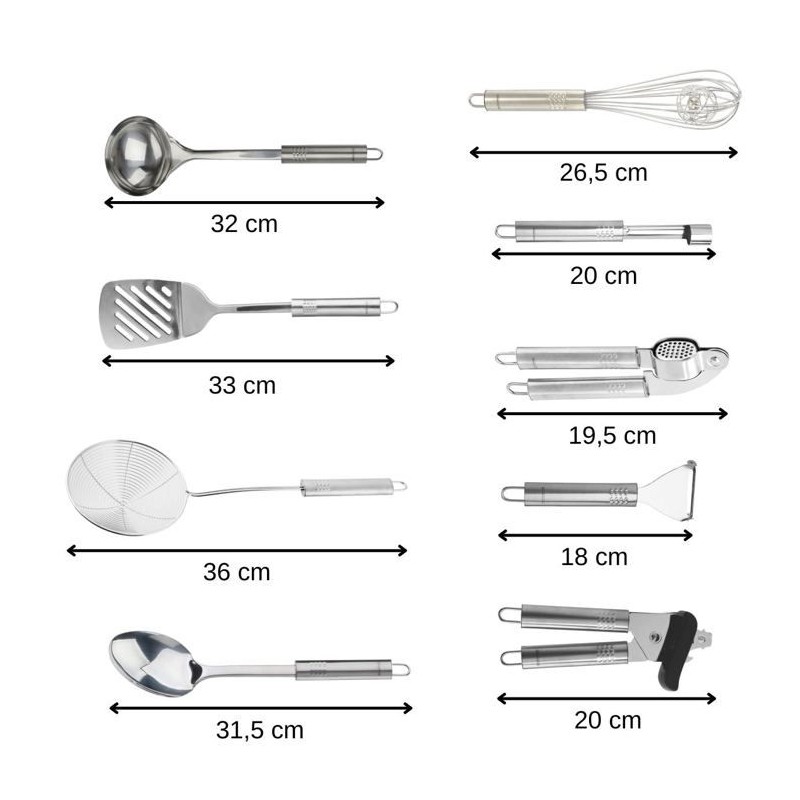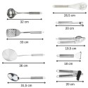 Ensemble de 9 ustensiles de cuisine Fackelmann en acier inoxydable, collection Ovale. De la cuillere de service a l'ouvre-boîte, en passant par les écumoires, ce set complet vous accompagnera dans toutes vos recettes salées et sucrées. LE PETIT + : Un seul achat pour réunir tous les essentiels de la cuisine et gagner du temps comme de la place. COMPOSITION et ENTRETIEN : Acier inoxydable robuste, compatible lave-vaisselle. DIMENSIONS : Vide-pommes 20 cm | Éplucheur 18 x 5,7 cm | Presse-ail 19,5 x 5 cm | Ouvre-boîtes 20,5 x 5,5 cm | Pelle a servir ajourée 33 cm | Cuillere 31,5 cm | Écumoire 35 cm | Fouet boule 26,5 cm | Louche 31 cm. CONTENU : 1 vide-pommes + 1 éplucheur + 1 presse-ail + 1 ouvre-boîtes + 1 pelle ajourée + 1 cuillere + 1 écumoire + 1 fouet boule + 1 louche. Ce set de 9 ustensiles Fackelmann réunit les indispensables pour équiper votre cuisine. Polyvalents et solides, ils vous aident aussi bien dans la préparation de plats salés que dans vos réalisations sucrées. Chaque piece est conçue en acier inoxydable de qualité et passe au lave-vaisselle pour un entretien simple. Pratiques, ces ustensiles disposent d'un trou de suspension, vous permettant de les accrocher et de libérer de l'espace dans vos tiroirs. Avec ce lot, vous avez tout sous la main : découper, éplucher, presser, servir ou mélanger devient facile et rapide. Depuis plus de 100 ans, Fackelmann conçoit des ustensiles pensés pour simplifier la cuisine au quotidien. De la pâtisserie aux accessoires pratiques, la marque propose des solutions adaptées a tous les profils de cuisiniers afin de réussir vos recettes en toute simplicité.