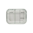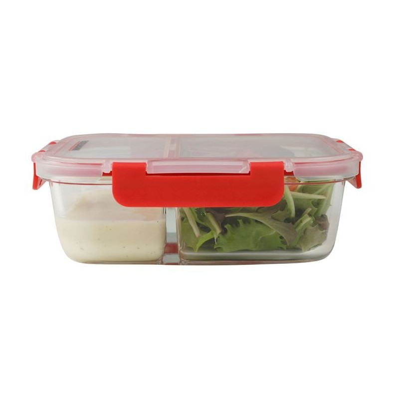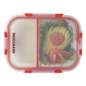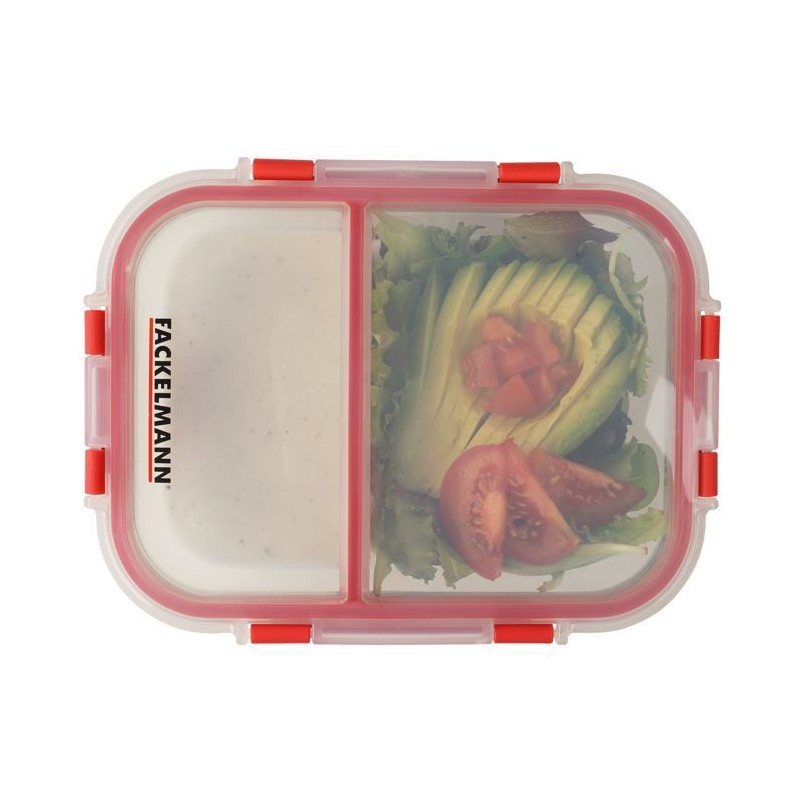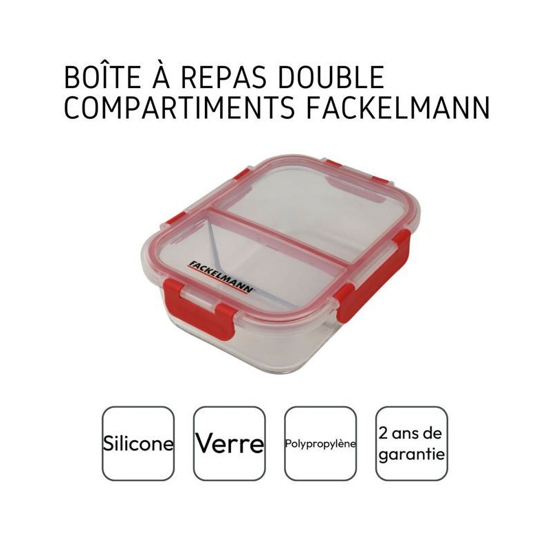 Lot de 2 boîtes repas en verre de 1000 ml avec compartiments, idéales pour le travail, les pique-niques ou les repas a emporter. LE PETIT + : Les compartiments permettent de séparer les aliments, pour une présentation soignée façon bento et des repas équilibrés. COMPOSITION : Boîtes en verre de qualité pour une utilisation saine et durable, avec couvercles hermétiques a 4 clips en plastique pour une conservation optimale. DIMENSIONS : Chaque boîte mesure 19,7 x 14,7 x 6 cm (extérieur), offrant un volume généreux tout en restant pratique a transporter. ENTRETIEN : Compatibles lave-vaisselle, four jusqu'a 600 °C (partie verre) et congélateur jusqu'a -40 °C. Ces boîtes repas en verre avec compartiments sont la solution parfaite pour organiser et transporter vos repas. Pratiques et robustes, elles permettent de séparer sauces, crudités, plats chauds ou desserts afin de préserver les saveurs et d'éviter les mélanges. Leur capacité de 1000 ml en fait un format idéal pour un repas complet. Faciles a emporter dans un sac, elles conviennent aussi bien pour le bureau que pour les sorties. Si vous suivez un régime ou souhaitez mieux équilibrer vos repas, ces boîtes vous aideront a gérer facilement les portions. Résistantes a la chaleur et au froid, elles s'adaptent a toutes vos envies : cuisson au four, conservation au congélateur ou simple transport. Grâce a leur fermeture hermétique, elles assurent une étanchéité parfaite et gardent vos préparations fraîches plus longtemps. Avec la qualité Fackelmann, simplifiez votre quotidien grâce a des accessoires conçus pour allier praticité et durabilité, que ce soit en cuisine, en pâtisserie ou dans le rangement de tous les jours.