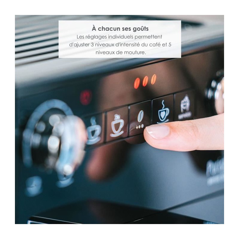 La machine a expresso automatique Purista® est dotée d'un moulin conique en acier inoxydable de haute qualité. Ce moulin se distingue par son fonctionnement particulierement silencieux. Design compact, avec ses 20 cm de large. Réglez l'intensité du café selon votre goût : léger, medium, corsé. Mode 2 tasses.