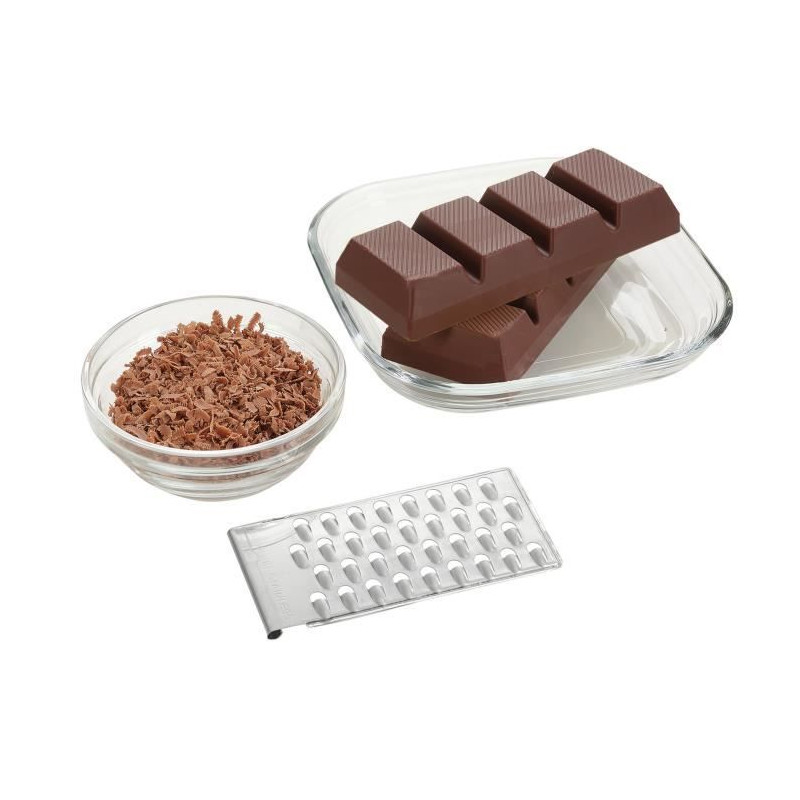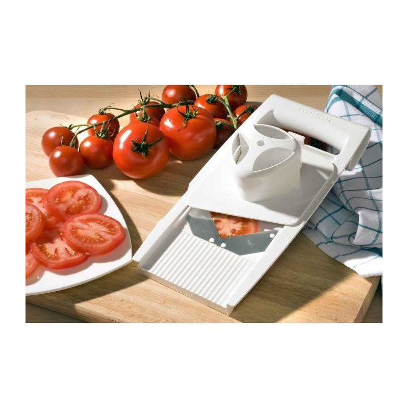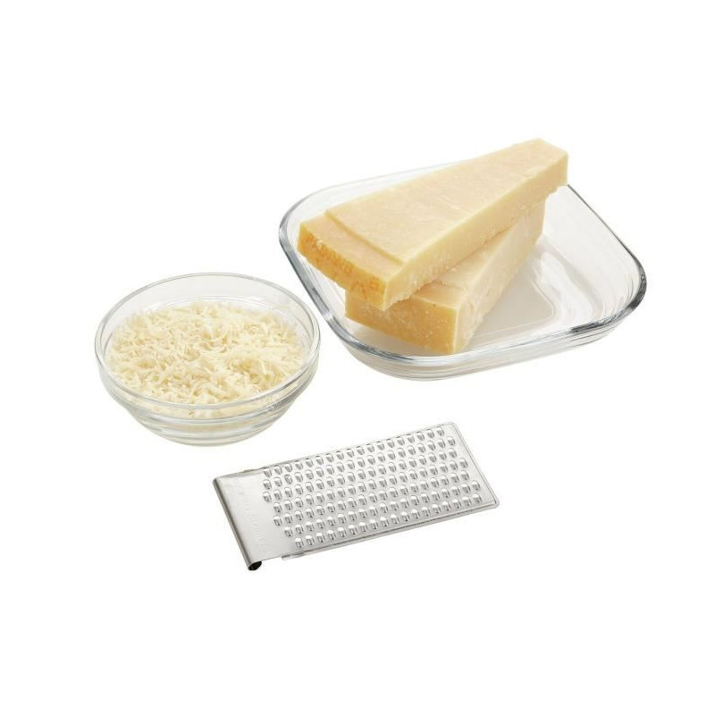 Qu'il s'agisse de râper en copeaux fins, grossiers ou en tranches, la multi-râpe 4+1 de Leifheit vous facilite la tâche et apporte des résultats parfaits. Meme les tomates sont coupées sans probleme en tranches régulieres grâce a la lame en V. Outre la grille pour les tomates, ce multitalents offre trois râpes fine, moyenne et grossiere ainsi qu'une lame droite réglable en hauteur pour couper fruits et légumes en tranches de différentes épaisseurs. Les grilles non utilisées se rangent facilement dans un emplacement prévu a cet effet. Le poussoir spécial protege les doigts, pour un travail en toute sécurité jusqu'au dernier morceau. Toutes les grilles sont en acier inoxydable et passent au lave-vaisselle.