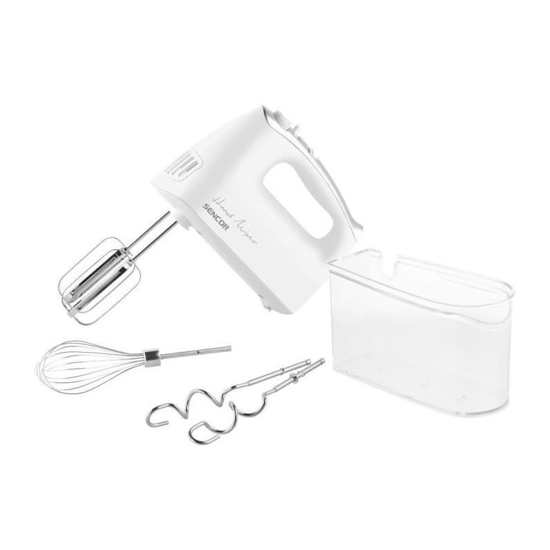 Batteur Electrique Sencor SHM 5206WH-EUE3 - niveaux de vitesse pour tous les types de recettes Bouton Turbo pour une vitesse maximale Boîte de rangement pour tous les accessoires 3 types d'accessoires : ensemble de fouets pour fouetter la creme fouettée, les cremes, la purée de pommes de terre, les pâtes a tartiner, les blancs et les jaunes d'oeufs ensemble de crochets pétrisseurs pour pétrir la pâte ensemble Balloon pour fouetter la creme, battre les blancs d'oeufs et mélanger les éponges et les desserts prets a l'emploi Bouton pour un retrait et un retrait aisés des accessoires Fonctionnement silencieux Nettoyage facile (les fouets, les crochets et le ballon peuvent etre lavés au lave-vaisselle) Fusible thermique contre la surchauffe Puissance d'entrée : 500 W Longueur du cordon d'alimentation : 1,2 m