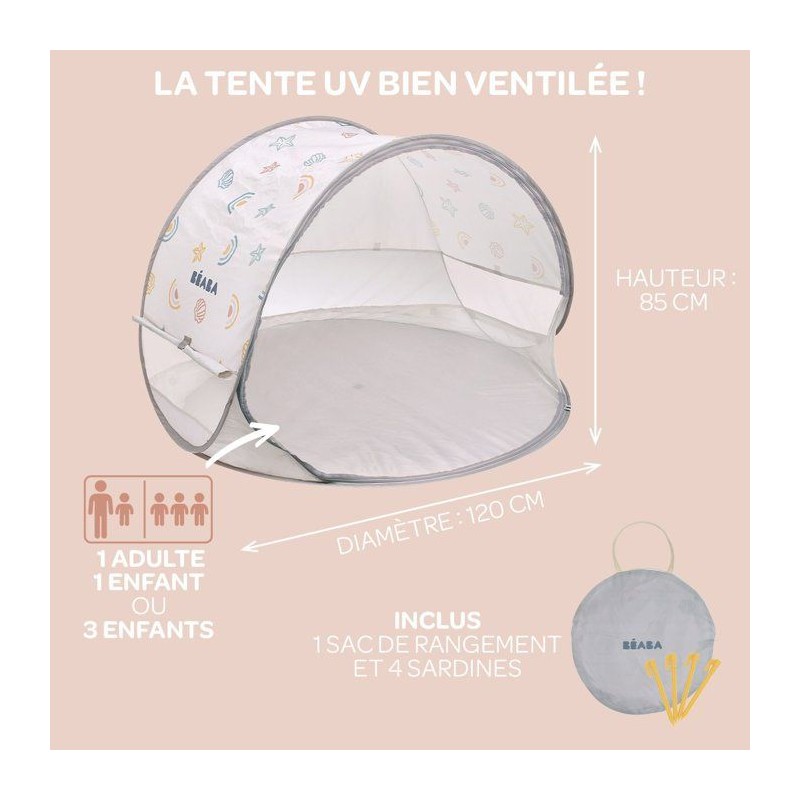 Conscient de la sensibilité de la peau des enfants aux rayons ultraviolets, Béaba a conçu la tente Breezy pour offrir une protection efficace contre le soleil sans compromettre le confort. Offrez a votre enfant une protection solaire fiable lors de toutes vos sorties en extérieur. Dotée d'une protection UPF50+, la tente Breezy filtre efficacement les rayons UV. Cette protection solaire maximale garantit que votre enfant puisse profiter des activités en plein air tout en étant protégé des effets nocifs du soleil. La tente Breezy se déploie et se replie facilement, permettant une installation rapide et sans effort où que vous soyez. Emportez-la avec vous a la plage, au parc ou dans le jardin pour offrir a votre enfant un abri instantané. Les panneaux en mesh latéraux de la tente Breezy permettent une circulation d'air optimale, assurant le confort de votre enfant meme par temps chaud. La ventilation 360° aide a maintenir une température agréable a l'intérieur de la tente. La tente Breezy est équipée d'une moustiquaire a zipper a l'avant et de bords légerement surélevés pour protéger votre enfant des insectes et du sable. Avec des dimensions généreuses de 120 x 85 cm, la tente Breezy offre un espace ample pour jouer et se reposer en toute tranquillité. La hauteur de 85 cm permet également aux adultes de s'asseoir confortablement a l'intérieur. Idéale pour une utilisation a la plage, au parc, dans le jardin ou en vacances, la tente Breezy accompagne toutes vos sorties en famille. Elle offre a votre enfant un espace sécurisé et confortable pour jouer et se reposer où que vous soyez. L'ouverture frontale avec une moustiquaire entierement dézippable facilite l'acces et permet une ventilation supplémentaire lorsque nécessaire. La tente Breezy est livrée avec un sac de transport pratique et 4 sardines pour une installation stable et sécurisée.