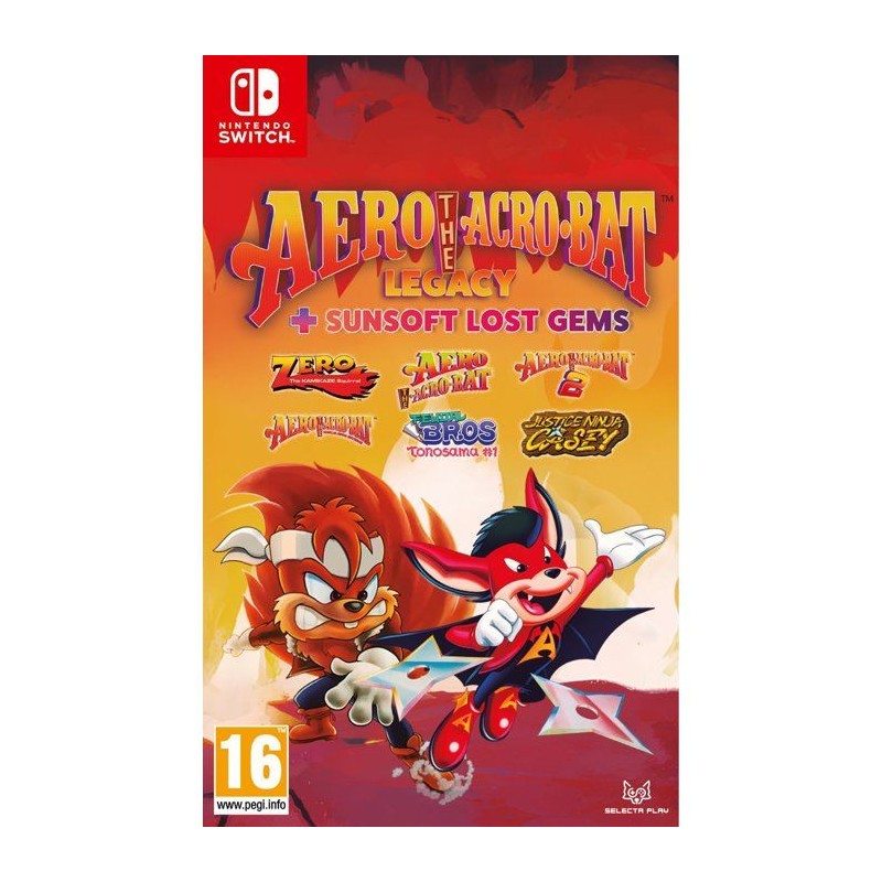 6 pépites rétro SUNSOFT réunies dans une compilation incontournable Aero The Acro-Bat Legacy + Sunsoft Lost Gems rassemble six titres emblématiques, avec un point commun : de l'action arcade a l'ancienne, du pixel-art et des aventures survitaminées. Au programme : la saga Aero The Acro-Bat, un remake modernisé, un jeu de plateforme ninja, un beat'em up et des raretés enfin accessibles. La compilation contient les 6 jeux suivants : - Zero The Kamikaze Squirrel - Aero The Acro-Bat 1 - Aero The Acro-Bat 2 - Rascal Rival Revenge - Feudal Bros (Tonosama #1) - Justice Ninja Casey Zero The Kamikaze Squirrel Alors qu'il travaille pour le machiavélique Edgar Ektor, Zero reçoit une lettre : sa foret est en danger et le pere de sa petite amie a été kidnappé. Il part sans permission... et Edgar n'a pas l'intention de le laisser filer. - 15 niveaux d'action ninja intense (dont certains avec des attractions). - Maîtrisez les compétences de combat de Zero et affrontez de redoutables boss. - Choisissez entre la version anglaise et la version japonaise. Aero The Acro-Bat 1 Edgar Ektor veut détruire le monde du spectacle. Il envahit un cirque, kidnappe le personnel... et c'est a Aero, la vedette acrobate, de sauver ses amis et sa petite amie Ariel. - 4 zones de 5 niveaux chacune (dont certains avec des attractions). - Utilisez les talents acrobatiques d'Aero pour accomplir les objectifs et progresser. - Choisissez entre la version anglaise et la version japonaise. Aero The Acro-Bat 2 Apres avoir contrecarré Edgar Ektor, Aero explore un musée de l'horreur... et se retrouve aspiré dans un lieu mystérieux. Edgar a survécu, et le « plan B » est en marche. - 8 zones de 3 niveaux chacune (dont certains avec des attractions). - Surmontez des obstacles mortels et affrontez d'étranges ennemis. - Choisissez entre la version anglaise et la version japonaise. Rascal Rival Revenge Un remake du classique, avec des améliorations visuelles et de gameplay, et une nouvel