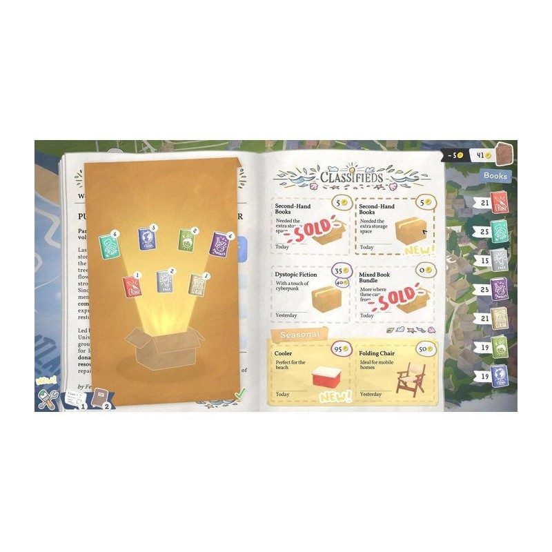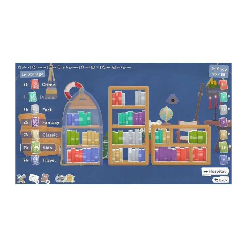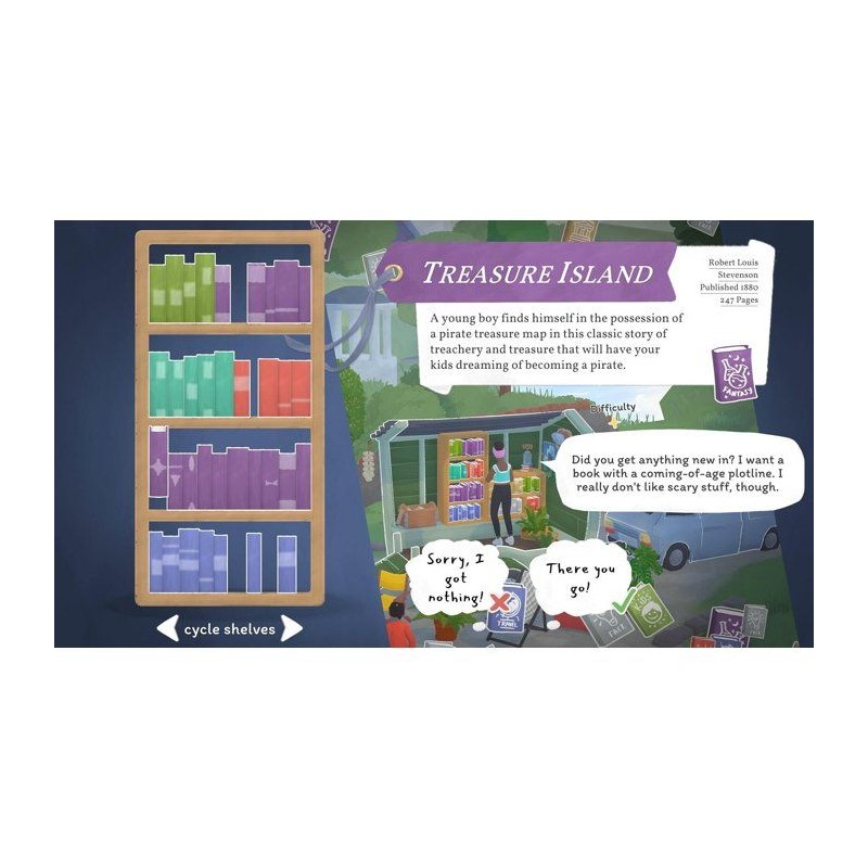 Laissez tout derriere vous pour ouvrir une petite librairie en bord de mer dans ce jeu de gestion narratif et cosy. Remplissez votre petite librairie d'une variété de livres et d'objets, installez-la dans des lieux pittoresques et apprenez a connaître les habitants de Bouquainville. Décorez votre petite librairie avec des objets. Vous voulez des plantes partout ? Ou peut-etre préférez-vous un éclairage a la bougie un peu sinistre ? Chaque objet posé affecte votre clientele et offre de nouvelles mécaniques. Recommandez le bon livre a la bonne personne ou essayez d'ouvrir ses horizons. Parfois, tout ce dont on a besoin pour un nouveau coup de coeur, c'est d'un coup de pouce ! Rencontrez les habitants excentriques de Bouquainville et aidez-les ! Ils ne mordent pas, c'est promis :) Approvisionnez votre librairie en plusieurs genres pour satisfaire les habitudes de lecture des gens du coin et voyez votre clientele augmenter. Chaque quartier de la ville attire une population un peu différente alors c'est en connaissant bien votre public que vous ferez prospérer votre librairie ! Explorez les coins pittoresques de Bouquainville-sur-Mer et apprenez a connaître la ville comme votre poche. Découvrez son histoire. Que s'est-il passé ? Et qui était vraiment Saint Bouquain ? Découvrez des secrets, collectionnez des objets et faites grandir votre collection de timbres en explorant les moindres recoins de Bouquainville. Qui sait ce que vous découvrirez ?