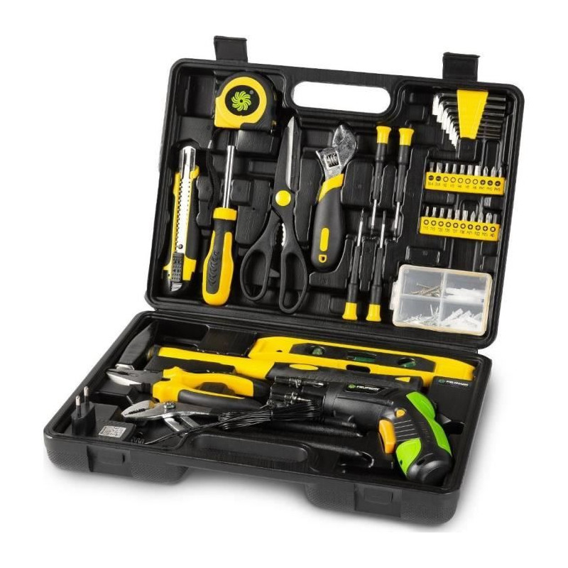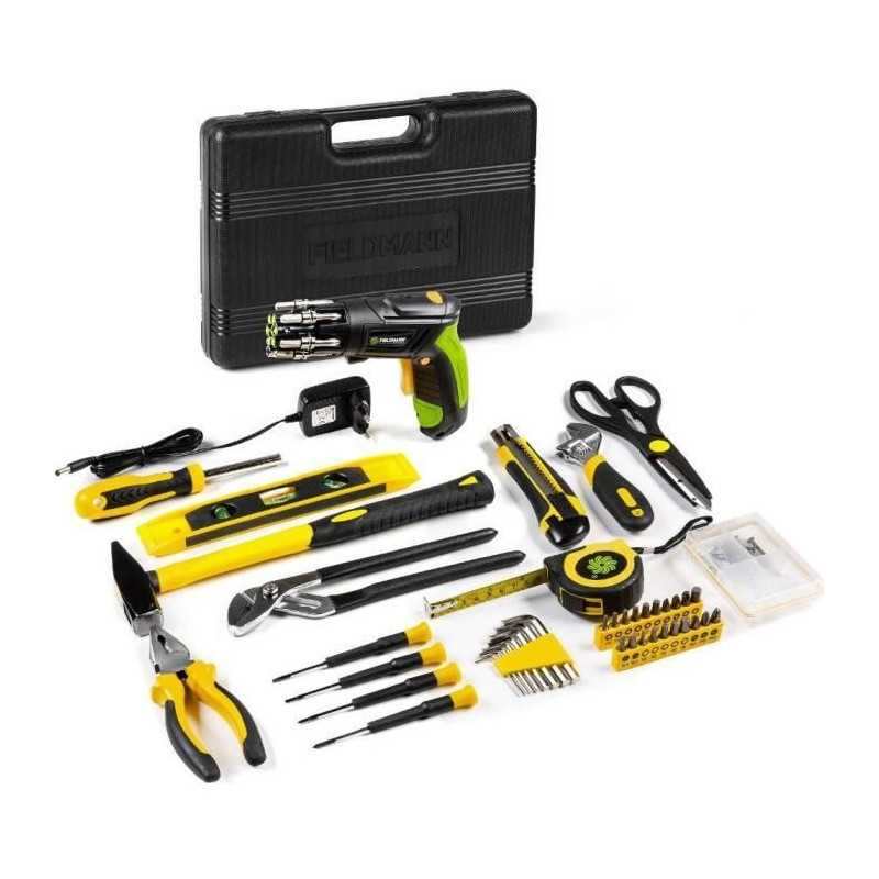 Découvrez le jeu d'outils Fieldmann FDG 5018-108AR, comprenant 108 pieces essentielles, dont un tournevis sans fil FDS 10102-A. Ce kit polyvalent inclut des pinces, un metre, un niveau a bulle et un marteau, le tout rangé dans une mallette robuste. Idéal pour tous vos projets de bricolage, il offre une solution complete et pratique.
