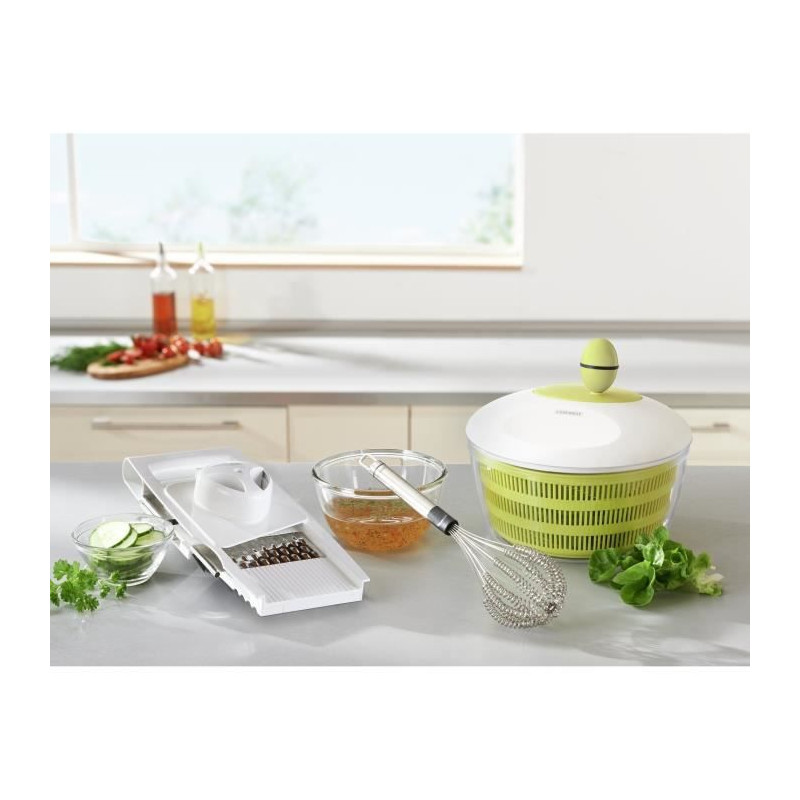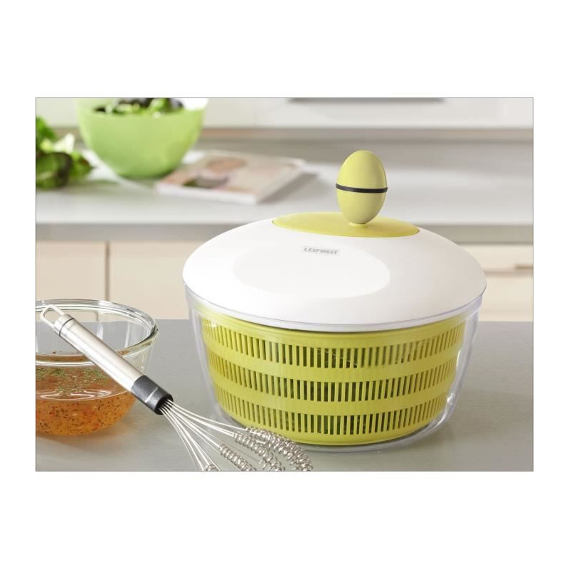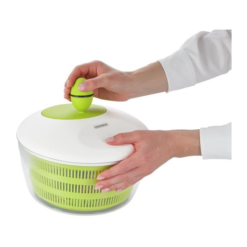Pour tous ceux qui aiment une cuisine saine : l'essoreuse a salade Leifheit met de la peche dans votre cuisine et réalise en un tour de main une salade croquante et fraîche prete a servir. Bloquer simplement le couvercle, faire tourner la manivelle a gauche et a droite et vider l'excédent d'eau a travers l'encoche fonctionnelle du couvercle. L'essoreuse dispose de patins en caoutchouc pour un confort de stabilité lors de l'essorage.