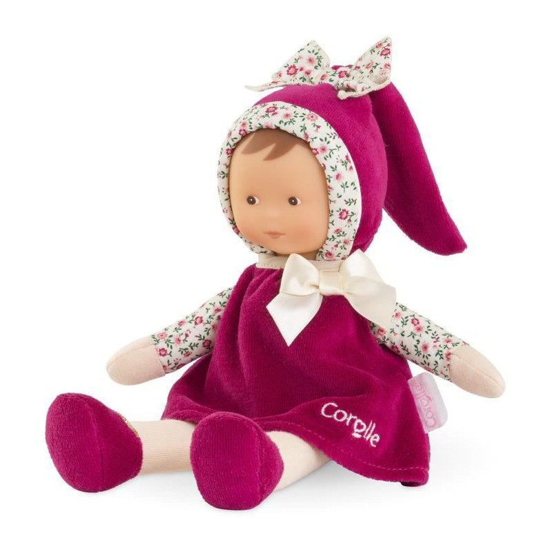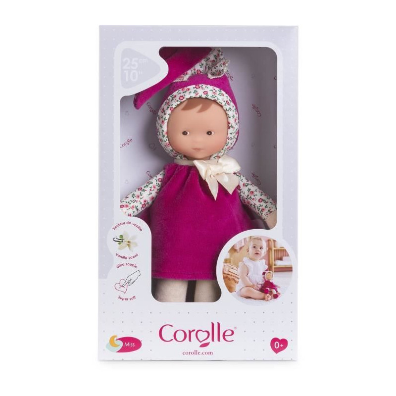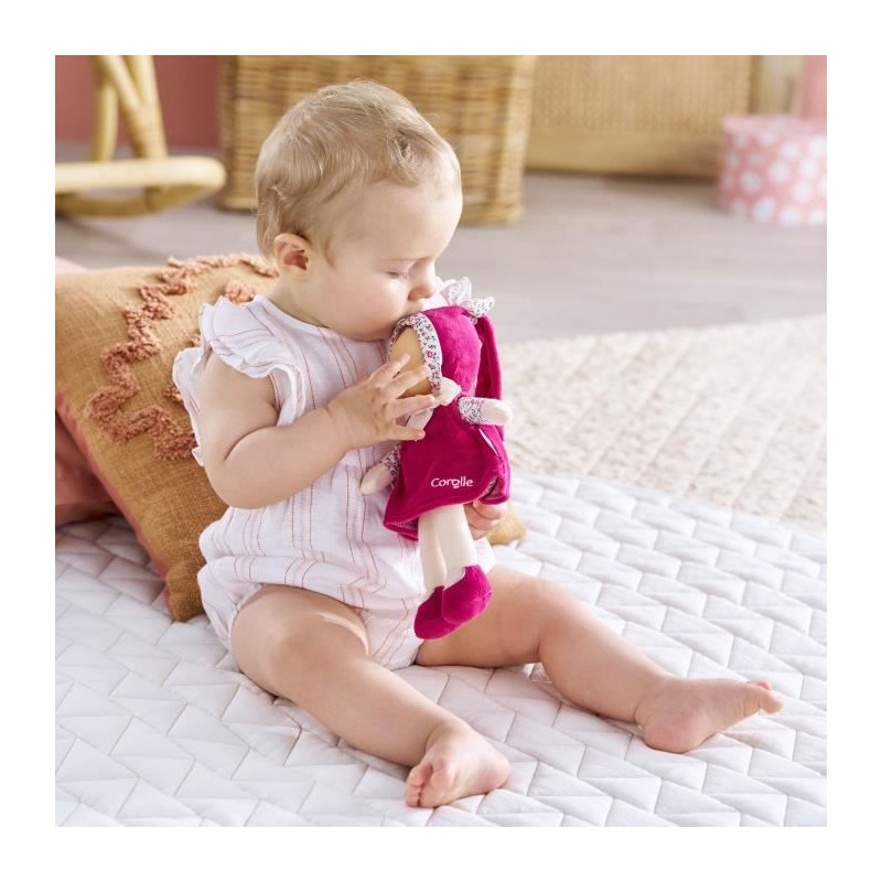 Découvrez le doudou COROLLE Miss Rose Grenadine, une adorable petite poupée de 25 cm. Avec son visage en vinyle rassurant et sa douce senteur de vanille, il est parfait pour apaiser les bébés des la naissance. Un compagnon idéal pour les moments de tendresse.