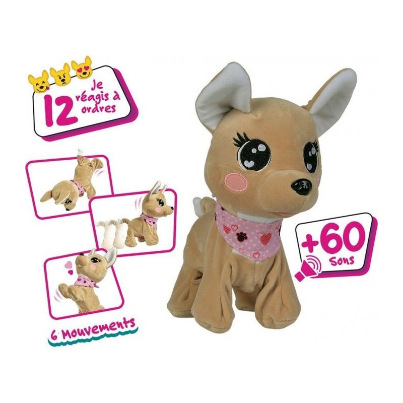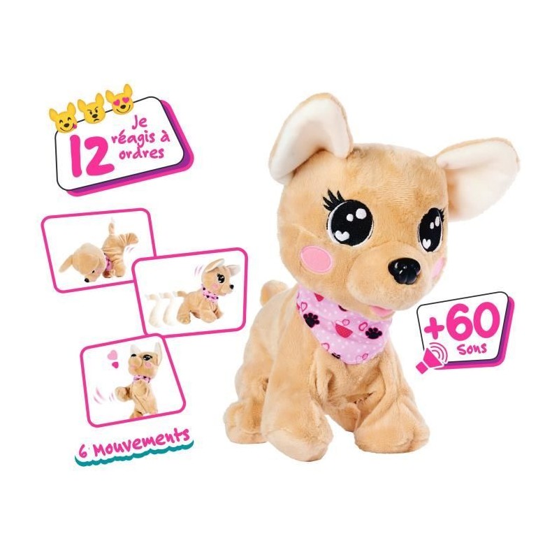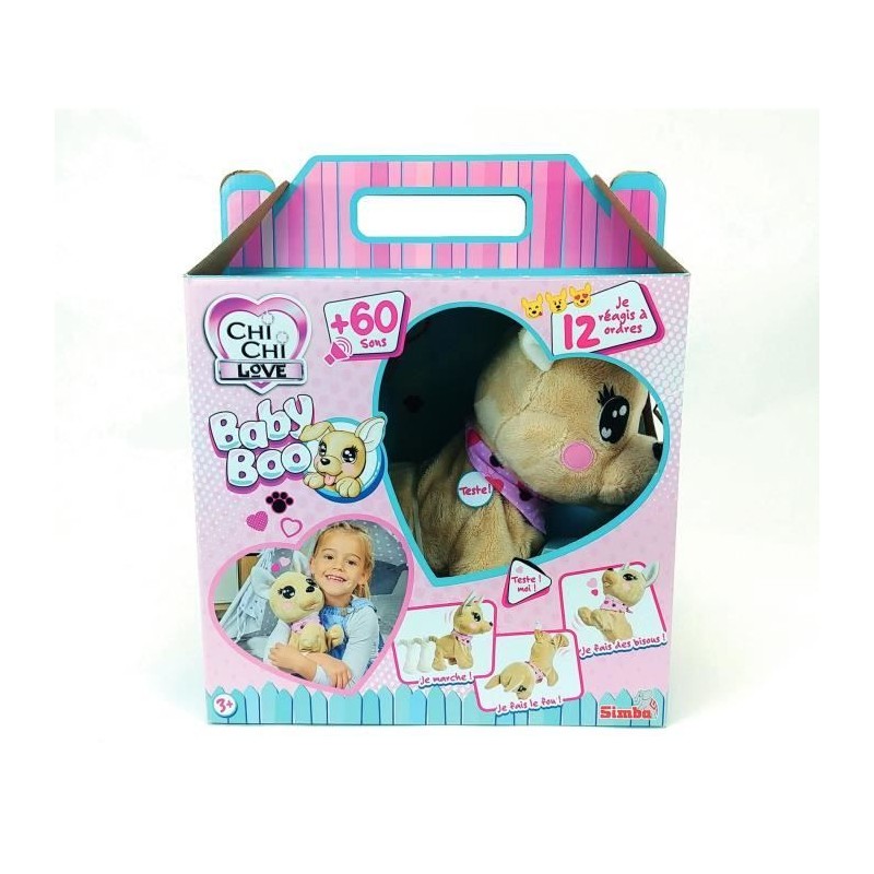 _x000D_ La peluche interactive Chi Chi Love Baby Boo (30cm) offre a vos enfants la possibilité d'avoir un véritable petit compagnon !_x000D_ Vos enfants ne quitteront plus leur adorable petit chien interactif !_x000D_ Ce petit compagnon a 4 pattes réagit a 12 commandes vocales et peut émettre plus de 60 sons différents. Il se comporte comme un vrai chien : il peut s'asseoir, se coucher, se lever sur les pattes arriere et les pattes avant et il danse..._x000D_ Vos enfants ne vous demanderont plus d'avoir une boule de poils, Chi Chi Love saura les combler et les amuser durant des heures entieres !_x000D_ Fonctionne avec 4 piles LR6 incluses._x000D_ Pack eco-friendly._x000D_ A partir de 4 ans._x000D_