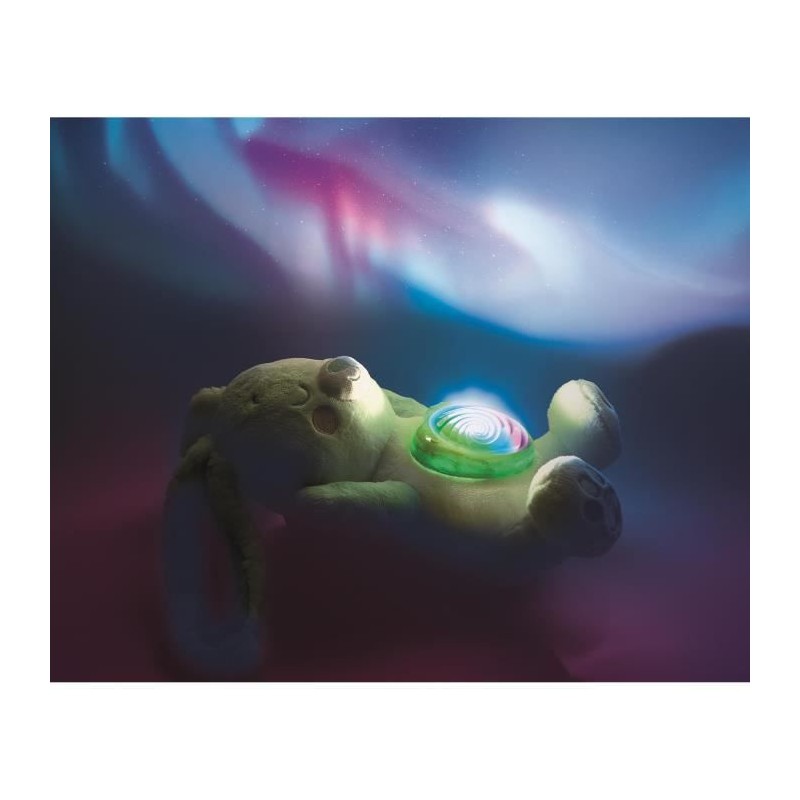 - Un lapin polaire tout doux avec un projecteur sur le ventre. - Il diffuse de douces mélodies, de la musique classique ainsi que des bruits blancs. - Le module sur le ventre projette une lumiere colorée apaisante, reproduisant de magnifiques aurores boréales, avec un choix parmi 10 couleurs différentes. - Une minuterie peut etre programmée et le volume audio peut etre réglé. - La peluche est lavable en machine (module électronique amovible).