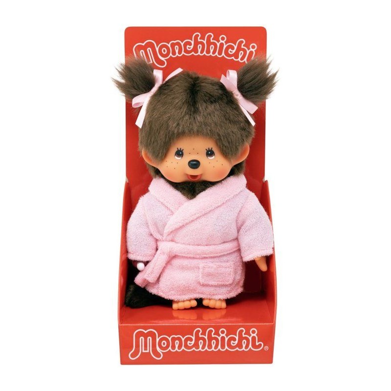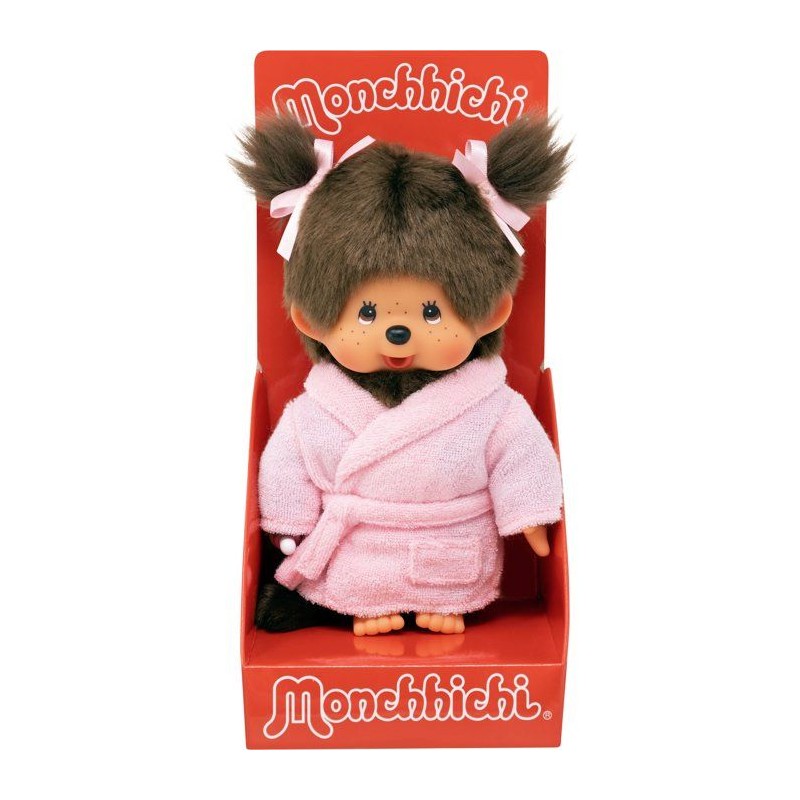 Monchhichi sort du bain en peignoir rose ultra doux ! a 20 cm, cette peluche iconique est idéale pour les câlins comme pour la déco de chambre. Détails soignés, bavoir classique et finitions premium : un compagnon tendre et indémodable qui traverse les générations.