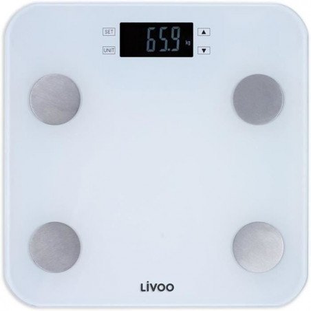 LIVOO DOM427W - Pese-personne impédancemetre - 13 mémoires utilisateurs - 180 kg - Plateau en verre trempé affichage LCD - Bl