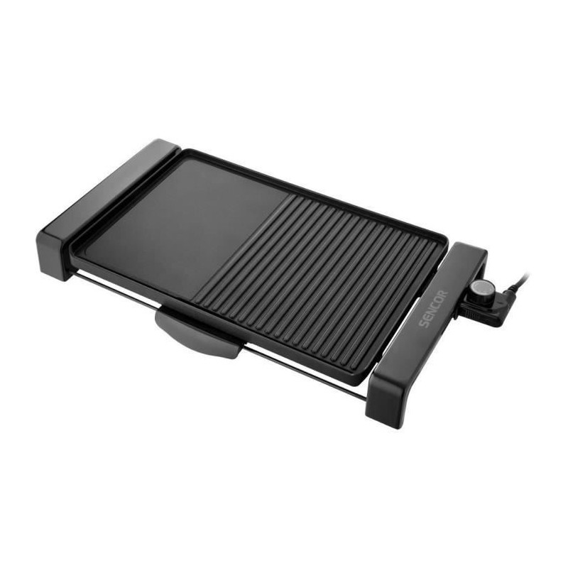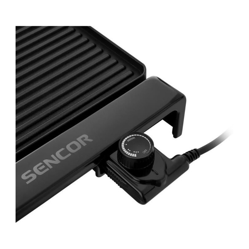 GRIL ÉLECTRIQUE Sencor SBG 106BK - Idéal pour griller toute l'année a l'intérieur de la maison et dans le jardin Combinaison de deux surfaces de cuisson différentes : une grande surface de cuisson (47 x 31 cm) et une surface de cuisson antiadhésive Thermostat réglable rotatif Fonction maintien au chaud pour maintenir la température (60 °C) Pieds antidérapants Puissance 2300 W Longueur du cordon : 1,0 m Dimensions sans thermostat (largeur x profondeur x hauteur) : 596 x 344 x 74 mm Dimensions avec thermostat (largeur x profondeur x hauteur) : 654 x 344 x 83 mm Poids : 3,1 kg Tension et fréquence : 220-240 V, 50 Hz