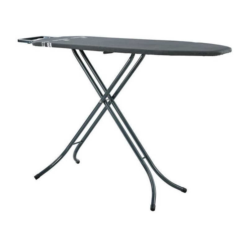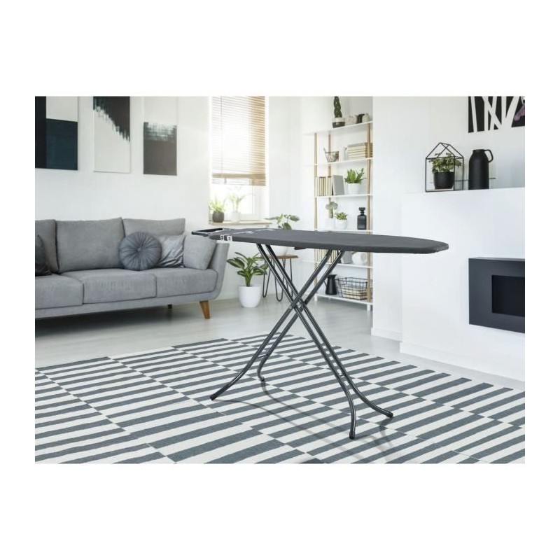 La table a repasser Classic M Black est remarquable non seulement par sa haute qualité mais également par son design moderne dans la couleur tendance anthracite. Rangement facile et encombrement réduit, hauteur réglable jusqu'a 88 cm et surface de repassage compacte de 120 x 38 cm : La table a repasser compacte Classic M Black de Leifheit est idéale pour les petits foyers. La table de repassage Classic M Black est équipée d'un repose-fer fixe en métal et d'un châssis stable réglable sur une hauteur comprise entre 69 et 88 cm. La hauteur de la table se regle rapidement, afin de s'adapter a toutes les morphologies tout en ménageant le dos. Pour éviter que le châssis ne s'ouvre lors du transport, la table Classic M Black est équipée d'une sécurité pour le transport.