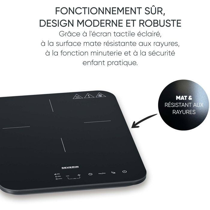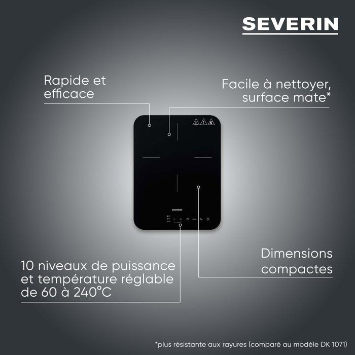 La plaque a induction SEVERIN DK1032 (2000 W) est compacte, légere et performante. Chauffe rapide, 10 niveaux de puissance et réglage de température 60-240°C. Surface vitrocéramique mate résistante. Sécurité enfant, arret automatique et détection des casseroles. Format nomade pratique. Garantie 2 ans.