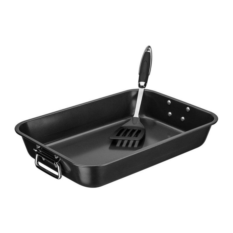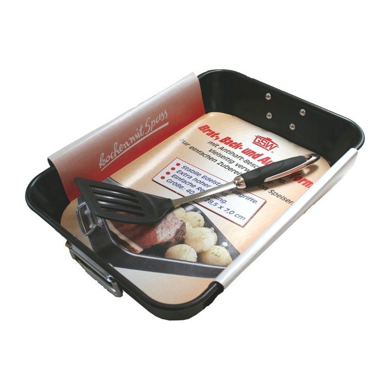 Plat a gratin - GSW - 40 x 28 x 7 cm - Acier massif - Anti-adhésif - Poignées inox rabattables - Avec Spatule - Noir