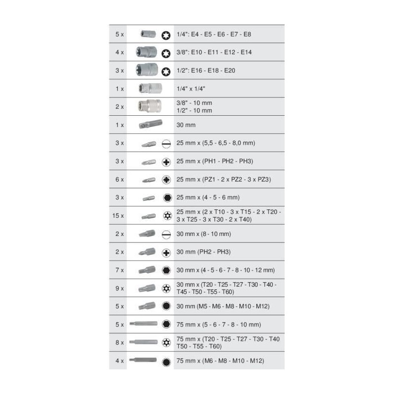 Module en mousse taille 1/3. Pour servantes et établis. Empreinte des outils découpée au laser. Mousse imputrescible. Attention : certains embouts livrés a l'unité dans le module ne sont disponibles qu'en boîtes de 5 a la vente.