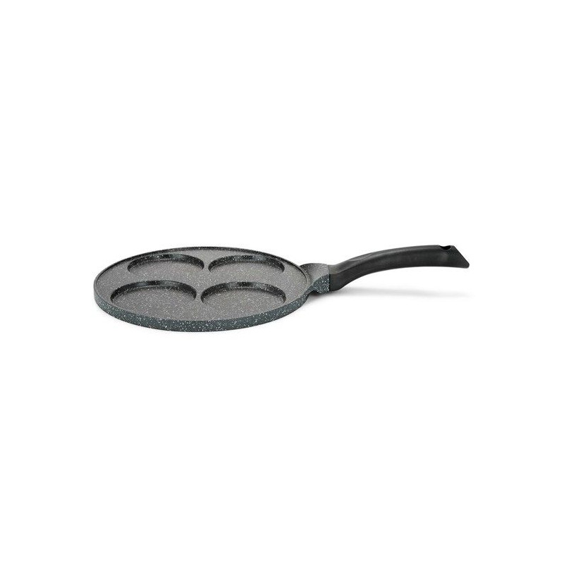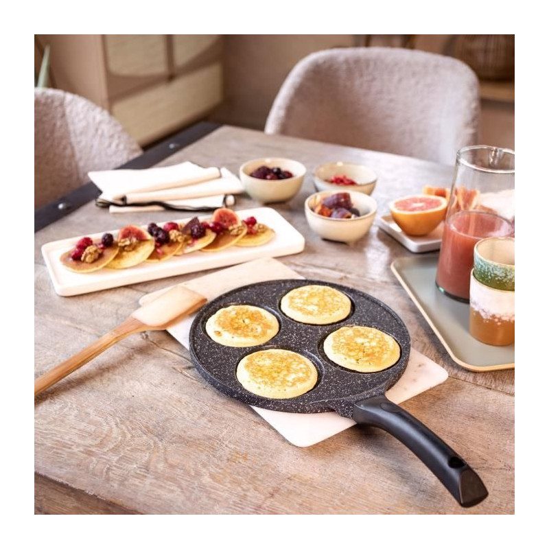 Poele a 4 empreintes d'un diametre de Ø 10cm, pour cuire simultanément 4 pancakes de taille identiques lors de brunchs ou petits-déjeunersRevetement en aluminium forgé antiadhésif qui facilite la cuisson sans accroche de pâtes épaisses mais aussi pâte a crepe ou oeufs au platPratique et durable avec la compatibilité tout feux dont induction