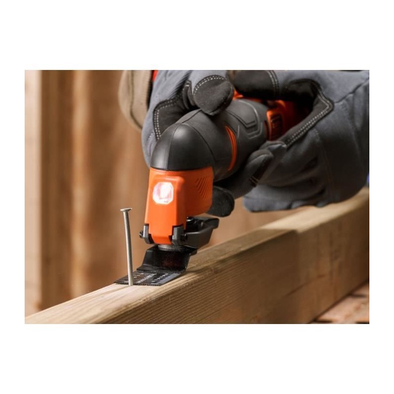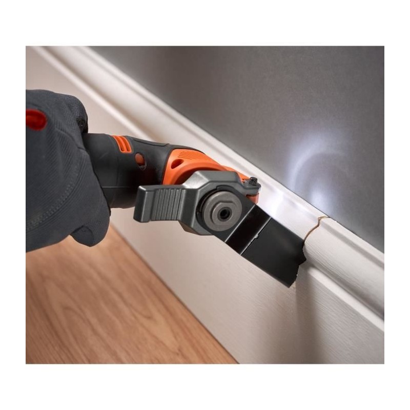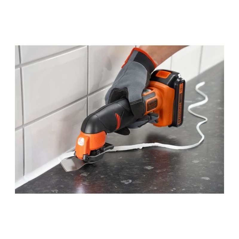 Ce multi-outil oscillant BLACK+DECKER 18V est le solutionneur de problemes idéal a la maison. Avec sa puissance de 18V et sa vitesse variable jusqu'a 18000 RPM, ce multi-outil est idéal pour enlever les sols en linoléum, les résidus de colle et jointer ou poncer le bois, polir ou dérouiller. Basculez entre différentes applications facilement et sans outils. La poignée Softgrip antidérapante et l'extraction de