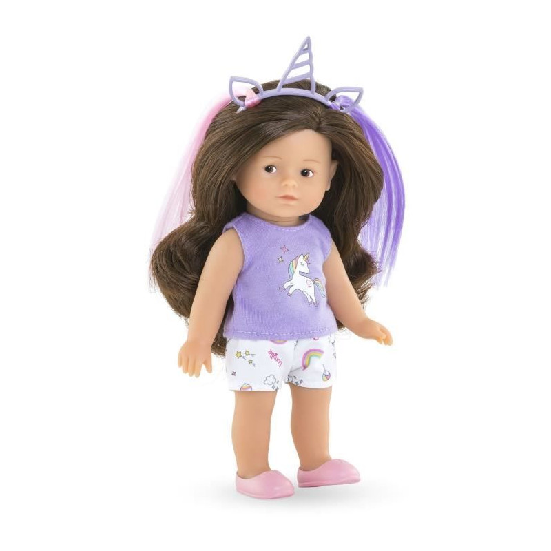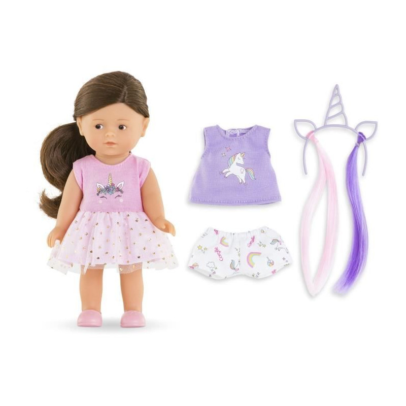 Coffret pret a offrir avec une poupée de 20 cm, un serre-tete licorne et une tenue de rechange. Poupée en vinyle, cheveux bruns soyeux, yeux peints et senteur vanille. Idéal des 3 ans, parfait pour les anniversaires et les surprises.