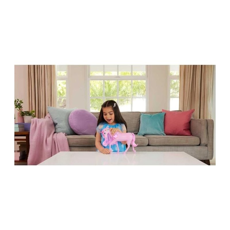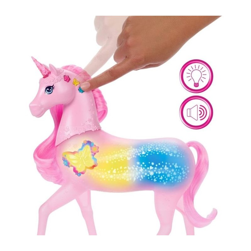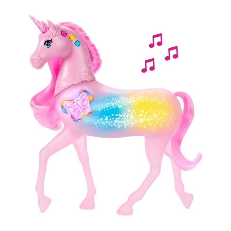 La Licorne Sons et Lumieres Barbie de MATTEL offre 20 combinaisons de sons et lumieres. Les enfants peuvent caresser la tete de la licorne pour un spectacle féerique. Avec des boutons colorés, ils personnalisent les lumieres rose, jaune et bleue. Un jouet magique pour les enfants de 3 a 10 ans.