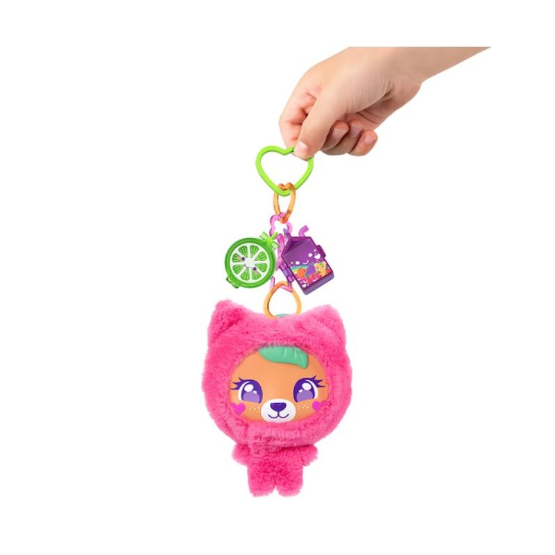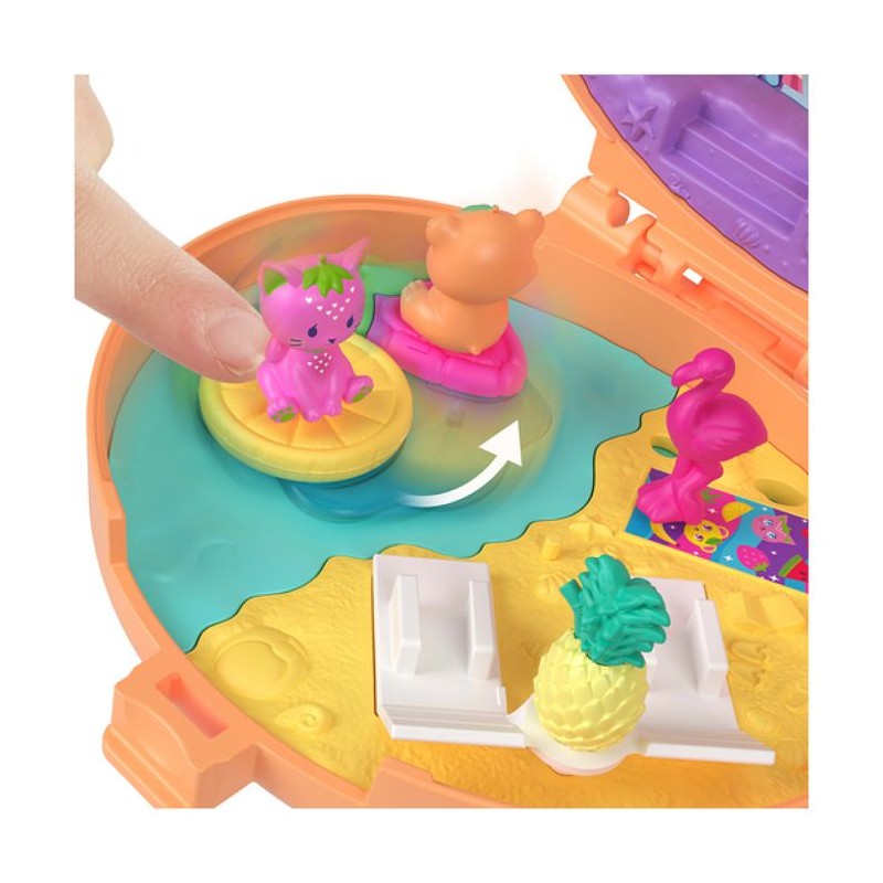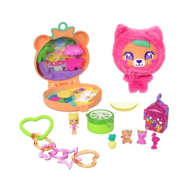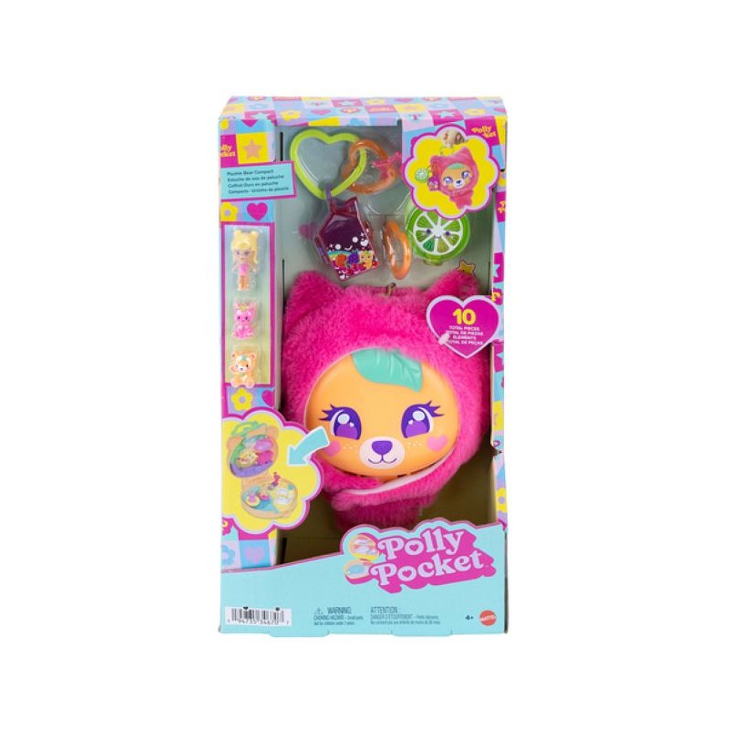 Découvrez le Coffret Ourson Tout Doux Polly Pocket (MATTEL, modele JKC79) : un mini-coffret en peluche amovible, idéal pour jouer a la maison ou en déplacement. Le jouet comprend une mini-figurine, un porte-clé, trois animaux et un accessoire en forme de fruit (6 éléments au total). a l'intérieur, un hamac qui se balance, un bain a remous tournant avec bouées en forme de fruits et deux breloques thématiques qui s'ouvrent pour ranger la figurine et les accessoires. Matiere peluche, couleur rose. Convient aux enfants des 4 ans. Parfait comme cadeau transportable pour les fans des univers Polly Pocket.