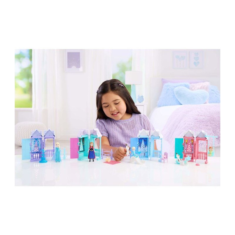 La maison accueille 1 mini princesse, 1 animal et 1 accessoire ! Elle s'ouvre sur 2 espaces. Elle se relie et s'empile aux châteaux de la collection.