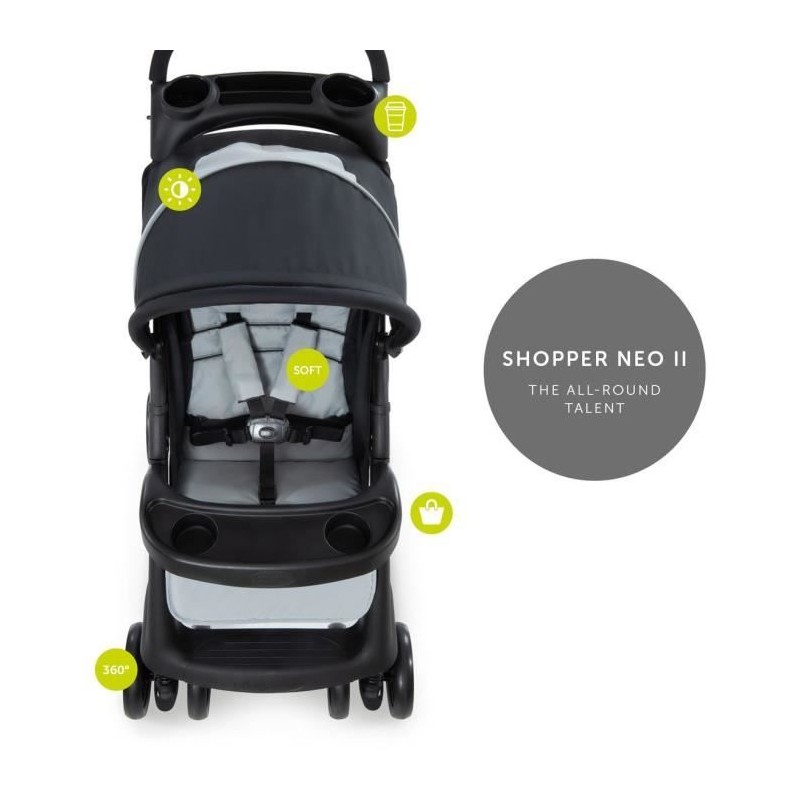 The Shopper Neo II stroller is ideal for the shopping spree. It offers a large space to sit or lie down to your child. Compact, it folds with one hand! Easy to maneuver and equipped with a large basket for shopping. Since birth. Mixed and delivered to the unit.