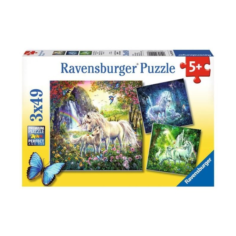 3 puzzles de 49 pieces. Dimensions d'un puzzle assemblé : 21 x 21 cm. Age minimum : 5 ans
