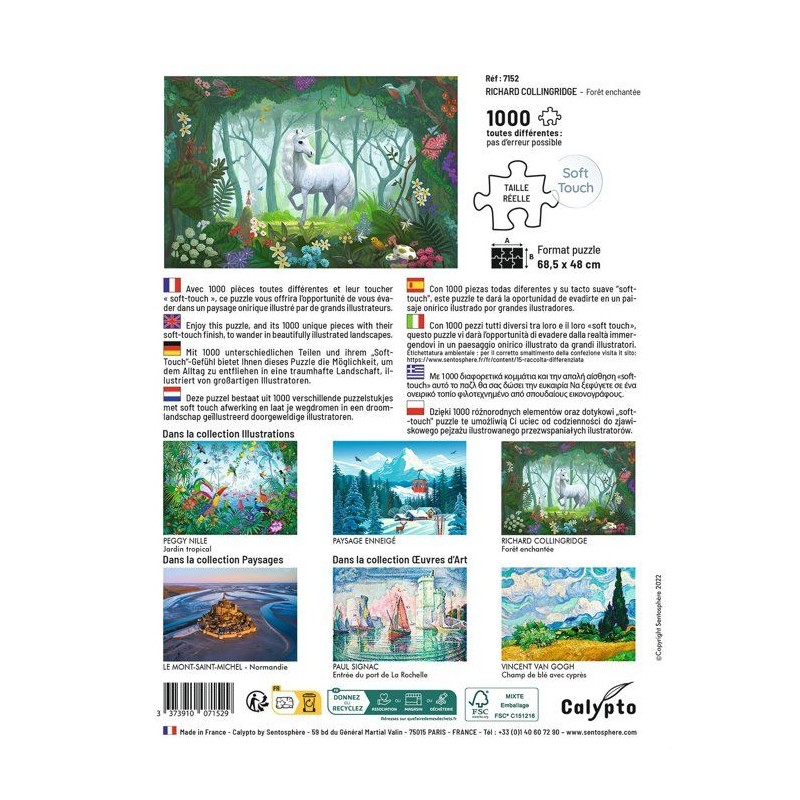 Avec 1000 pieces toutes différentes, une qualité d'impression issue des dernieres technologies permettant d'obtenir de nouvelles couleurs, en particulier au niveau des bleus et des verts, un toucher soyeux, des boîtes plus compactes et une fabrication française, pour limiter l'empreinte carbone, la gamme Calypto propose un véritable renouveau dans le monde des puzzles.