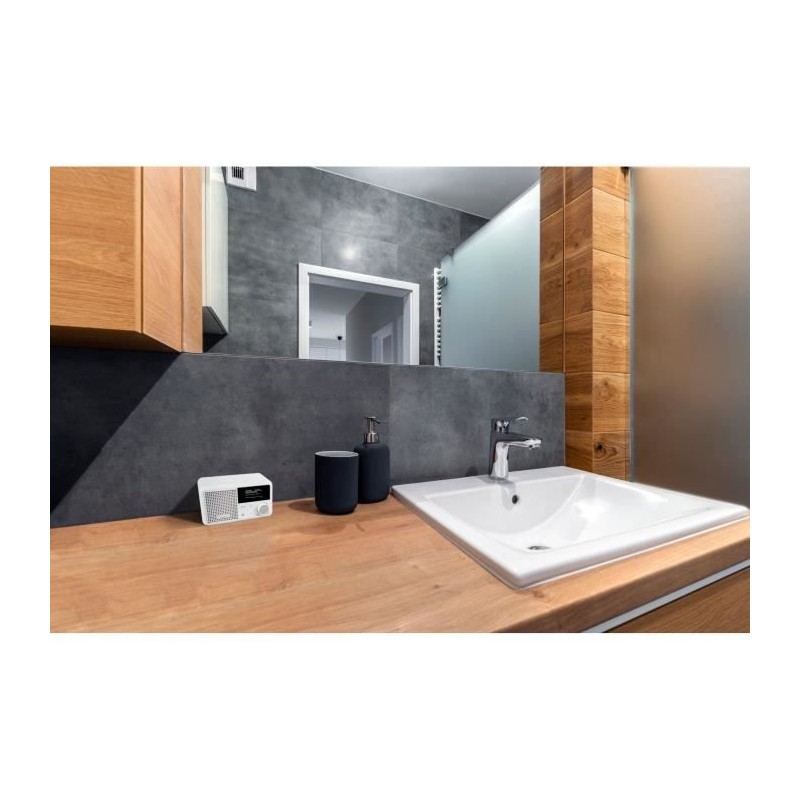 Cette radio Bluetooth/DAB+ ultra-compacte est idéale pour la cuisine ou la salle de bain grâce a sa protection IPX1. Elle dispose d'un écran couleur TFT de 1,47", de 40 stations préréglées DAB+ et FM, d'une batterie intégrée offrant jusqu'a 6,5 heures d'autonomie, d'un égaliseur, d'une minuterie de mise en veille, d'un réveil avec snooze, et d'une puissance de sortie de 2 W RMS.