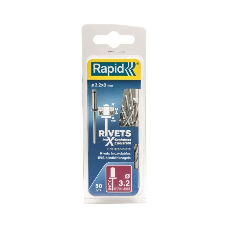 Blister pack of 50 stainless rivets - Diameter: 3.2x8mm + drill bit - Stainless steel ISO304 - Very hard material for a solid and permanent fixing - Very long life.