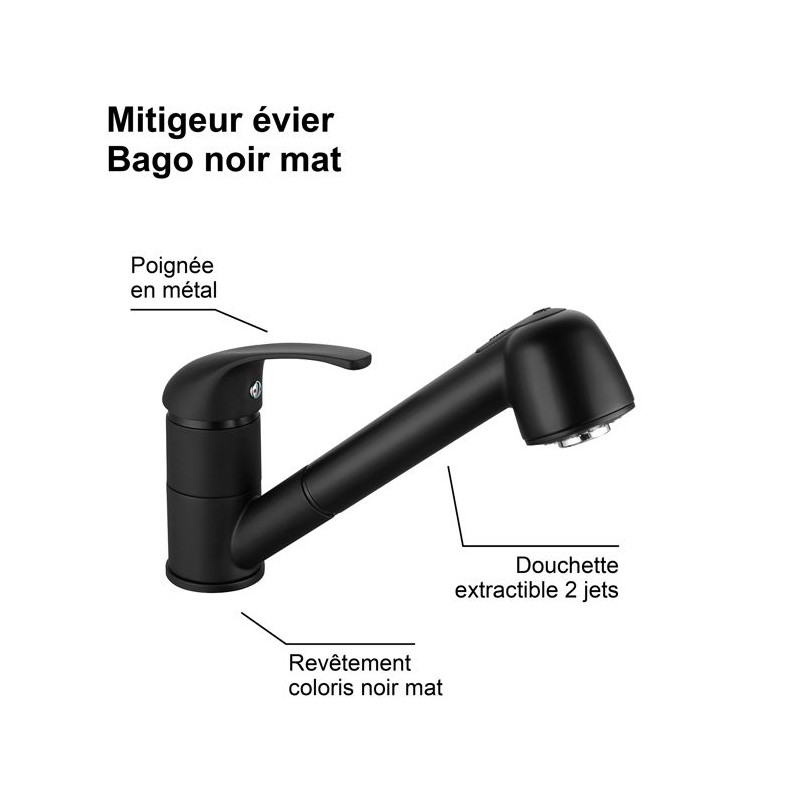 Mitigeur Évier - BAGO - Douchette Extractible 2 Jets - Noir Mat - Design Classique - Installation Facile
