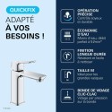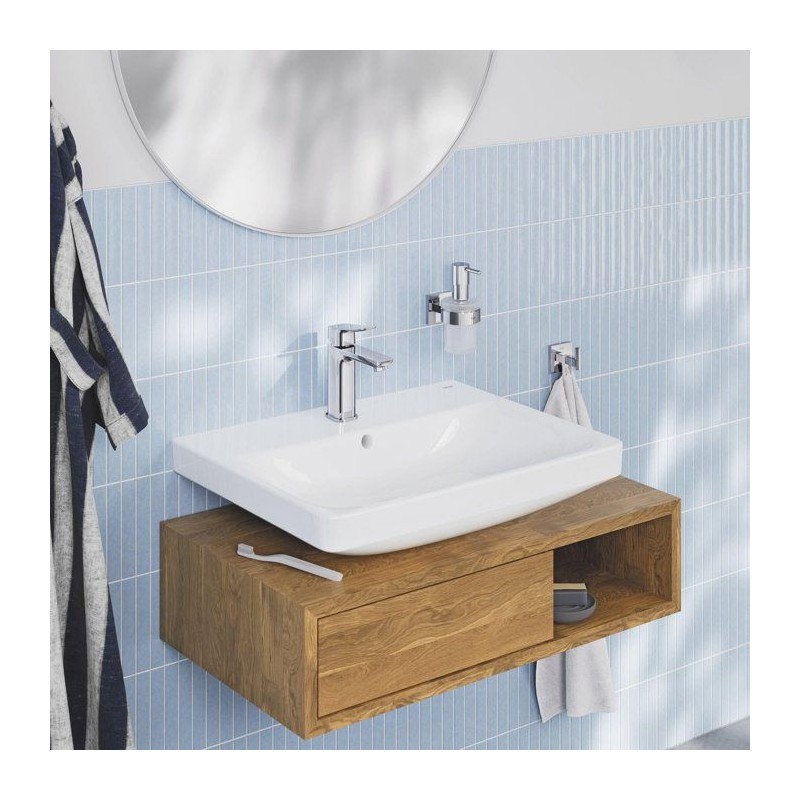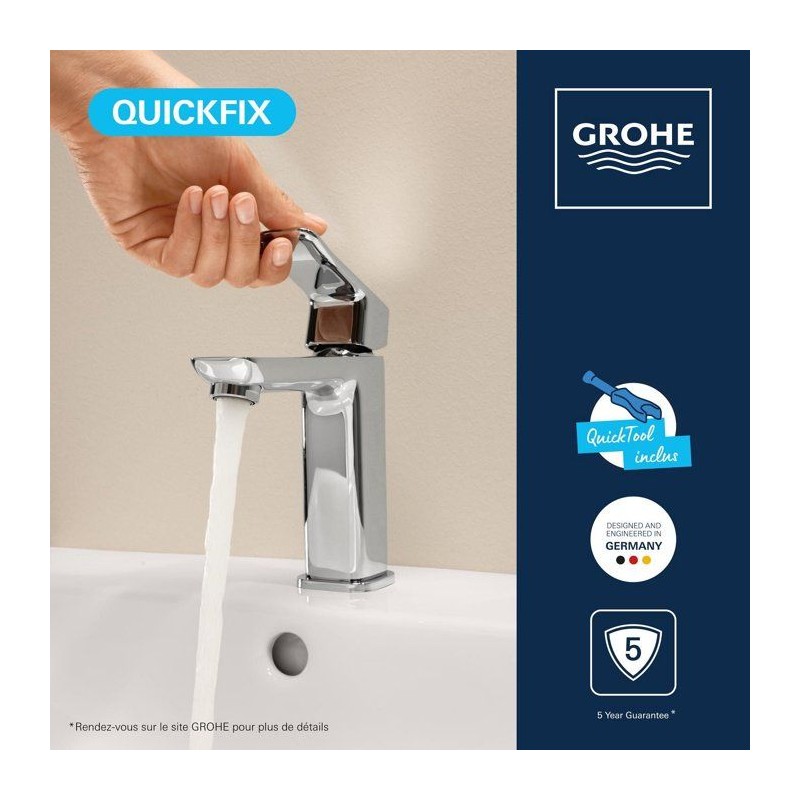 Découvrez le mitigeur de lavabo GROHE DICE Taille M en finition Chrome, un mitigeur de la gamme GROHE DICE conçu pour offrir confort d'utilisation, performance durable et design moderne. Pensé pour s'intégrer facilement dans toutes les salles de bain, ce modele de taille M associe une finition haut de gamme et un levier métallique précis pour une utilisation fluide au quotidien. Grâce a la technologie GROHE SilkMove, la cartouche en céramique garantit un contrôle souple et durable du débit et de la température. Le limiteur de débit et le limiteur de température vous permettent de réaliser des économies d'eau tout en profitant d'un jet parfaitement maîtrisé. Avec un débit maximal de 5 l/min a 3 bars, ce mitigeur allie efficacité hydraulique et confort d'utilisation. L'installation est facilitée grâce au systeme GROHE FastFixation/QuickMount ainsi qu'a l'outil QuickTool inclus selon les versions. Les flexibles de raccordement souples et le corps lisse avec vidage clic-clac (selon modele) completent un ensemble pensé pour durer. La finition longue durée résiste parfaitement au calcaire, aux rayures et a l'usure du quotidien. Un choix élégant et fiable pour valoriser votre salle de bain.