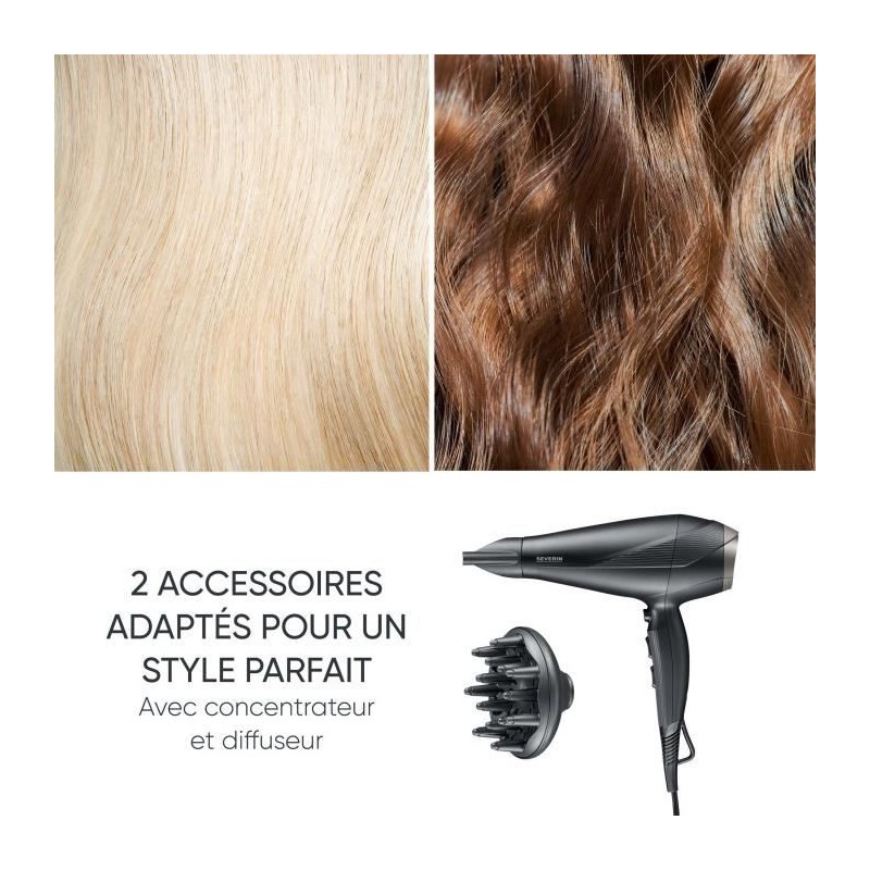Seche-Cheveux Professionnel SEVERIN HT 0167 : Puissance 2300W & Moteur AC. Découvrez la performance brute avec le seche-cheveux SEVERIN HT 0167. Équipé d'un moteur AC professionnel, cet appareil de 2300W est conçu pour un séchage ultra-rapide et une longévité exceptionnelle, idéal pour un usage intensif au quotidien. Technologie Ionique pour des Cheveux Sublimés : Dites adieu a l'électricité statique ! La technologie ionique intégrée réduit efficacement les frisottis. Vos cheveux retrouvent leur douceur naturelle et une brillance éclatante, pour un résultat digne d'un salon de coiffure apres chaque utilisation. Contrôle Total et Flexibilité de Coiffage : Grâce a ses réglages modulables, ce seche-cheveux s'adapte précisément a votre type de chevelure : - 3 niveaux de température et 2 réglages de puissance. - Bouton de flux d'air froid : La touche indispensable pour fixer votre coiffure durablement. - Câble XL de 280 cm : Offre un rayon d'action maximal pour une liberté de mouvement totale. Accessoires Inclus : Volume et Précision. Le SEVERIN HT 0167 est livré avec deux accessoires amovibles indispensables : - Diffuseur : Pour un séchage en douceur et un volume spectaculaire sur cheveux bouclés ou ondulés. - Concentrateur : Pour diriger le flux d'air avec précision et réussir vos brushings et lissages structurés. Qualité Allemande et Ergonomie : Alliant robustesse et confort, ce modele dispose d'un anneau de suspension pratique. Fidele a l'expertise SEVERIN, il garantit fiabilité et performance durable.