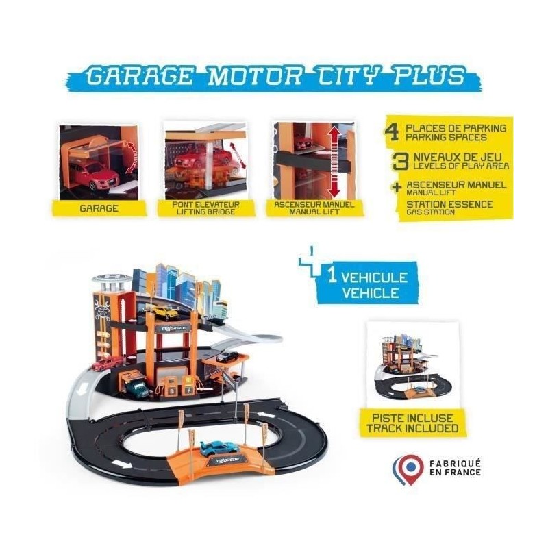 Tu vas pouvoir t'amuser des heures entieres avec ton garage Motor City Plus !_x000D_ Ses différents niveaux disposent de plusieurs fonctions : pompe a essence, ascenseur manuel, atelier, rampe, garage a voitures, héliport, pistes..._x000D_ Tu vas pouvoir t'imaginer de nombreuses aventures !_x000D_ 1 véhicule est inclus afin que tu puisses profiter de ton garage des le déballage !_x000D_ A partir de 3 ans - Fabrication française.