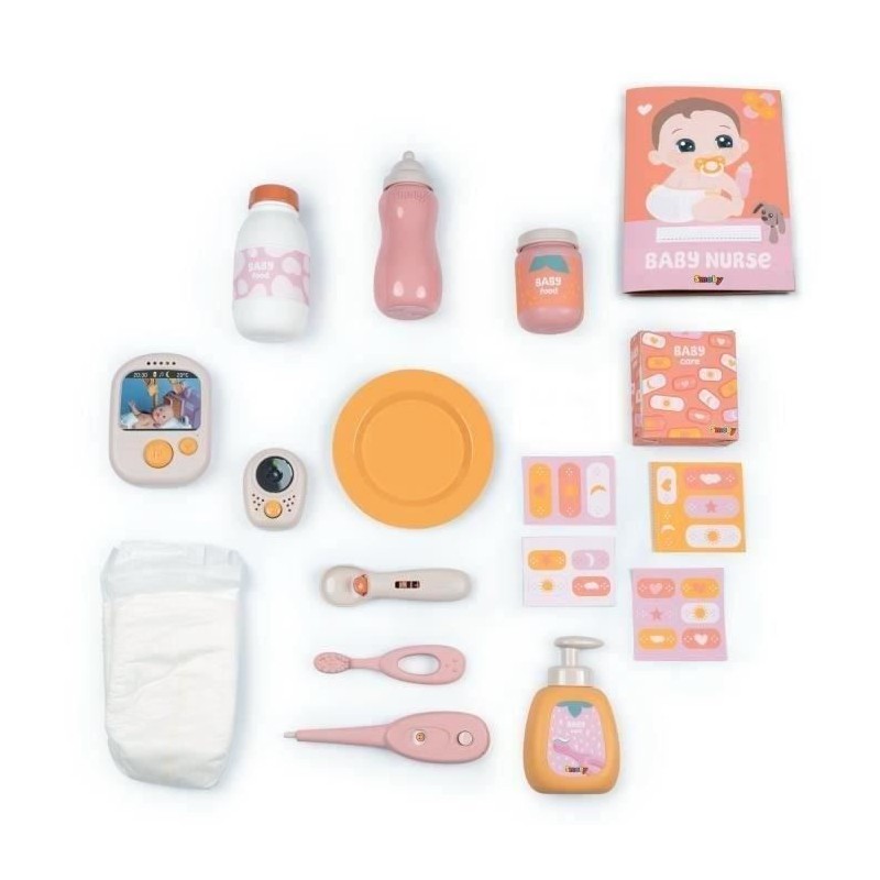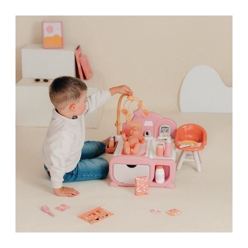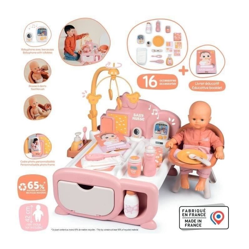Avec la nurserie cocoon Baby Nurse votre enfant pourra apprendre a prendre soin de son poupon comme une véritable maman ou un véritable papa !_x000D_ Le produit est composé d'un espace soin et nuit et d'un espace repas, votre petit pourra alors imiter tous vos faits et gestes !_x000D_ La nurserie possede une table avec une chaise pivotante, une table a langer/lit, un cadre photo personnalisable, un mobile mécanique, et divers espaces de rangement._x000D_ De nombreux accessoires sont inclus pour agrémenter les fonctions de jeu : 1 caméra factice, 1 baby phone électronique avec plusieurs sons de berceuses, 1 biberon, 1 assiette, 1 couche, 1 flacon pousse-mousse, 1 bouteille de lait, 1 brosse a dents, 1 thermometre mécanique, 1 petit pot et 1 cuillere avec de la nourriture factice, 1 couche, 1 boite de pansements et des planches de pansements._x000D_ Les différents espaces de rangement permettront a votre petice, 1 couche, 1 boite de pansements et des planches de pansements._x000D_ Les différents espaces de rangement permettront a votre petit de s'organiser et de ranger les accessoires._x000D_ Adapté aux poupons jusqu'a 42cm. Poupon non inclus._x000D_ _x000D_ 2 piles LR03 non incluses._x000D_ Ce produit contient 65% de matiere recyclée._x000D_ A partir de 3 ans - Fabrication française.