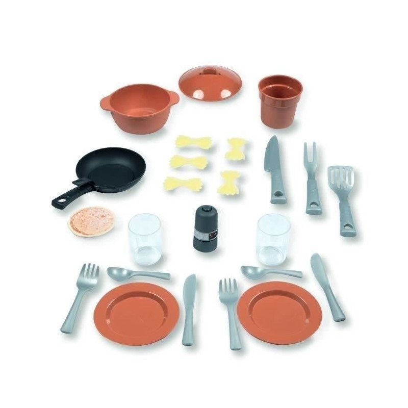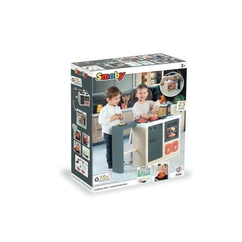 Une cuisine au design moderne inspirée des tendances actuelles. Avec une surface de jeu a 360°, cet îlot deviendra un élément central et permettra aux petits chefs de cuisiner et d'interagir avec ses amis en préparant les repas. _x000D_ Cette cuisine dispose des fonctions traditionnelles :_x000D_ 1 large coin repas ou plan de travail_x000D_ 1 frigo_x000D_ 1 four_x000D_ 1 table de cuisson avec un bouton cric cric_x000D_ 1 évier intégré avec un robinet au design tendance_x000D_ 2 poubelles de tri._x000D_ 23 accessoires sont également inclus :1 poele avec lanceur, 1 casserole avec 1 couvercle, 1 crepe, 5 pâtes, 1 moulin poivre et sel, 2 assiettes, 2 fourchettes, 2 couteaux 2 cuilleres, 2 verres et 3 ustensiles de cuisines._x000D_ contient de la matiere recyclée._x000D_ fabriqué en France