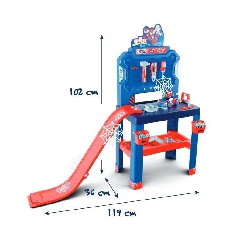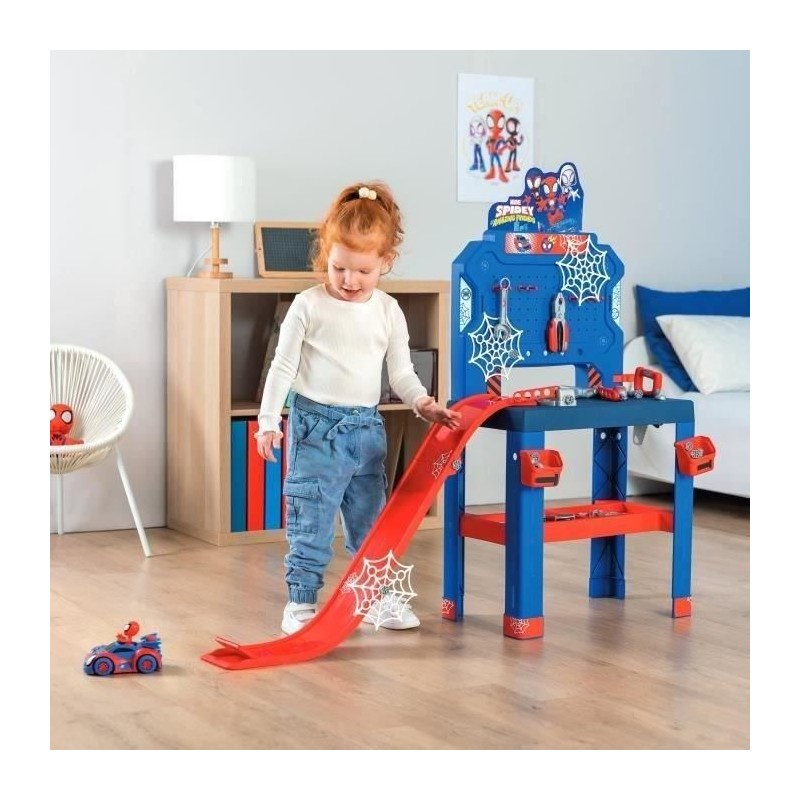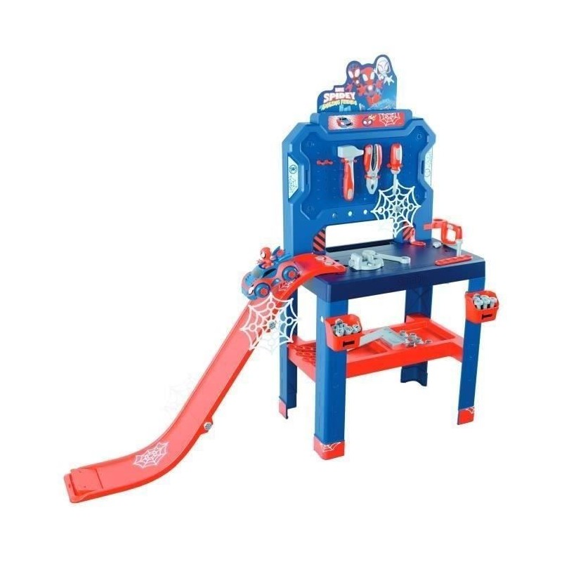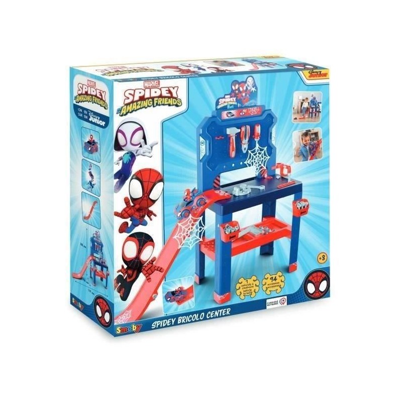 L'établi Bricolo Center Spidey et ses amis extraordinaires te permettra d'etre un bricoleur dans l'univers de Spidey ! _x000D_ _x000D_ Les différentes activités que propose le Bricolo Center Spidey te plairont sans aucun doute. _x000D_ _x000D_ De nombreuses fonctions de jeu sont possibles, tu peux construire ta propre piste de lancement et assembler la voiture de Spidey pour la faire sauter sur le tremplin !_x000D_ _x000D_ L'établi est tres équipé avec plus de 90 accessoires : 2 bacs de rangement, 6 outils (scie, marteau, équerre, clé plate, tournevis, pince), 6 regles de construction, 20 vis, 6 clous, 18 écrous, le véhicule de Spidey a assembler, 1 étau, 4 toiles d'araignées... _x000D_ _x000D_ La hauteur du plateau (51cm) est parfaitement adaptée aux enfants a partir de 3 ans. _x000D_ _x000D_ L'établi Bricolo Center Spidey se distingue grâce a ses nombreuses fonctions de jeu, qui te permettront de ne jamais t'ennuyer._x000D_ _x000D_ Fabrication Français Spidey se distingue grâce a ses nombreuses fonctions de jeu, qui te permettront de ne jamais t'ennuyer._x000D_ _x000D_ Fabrication Française.