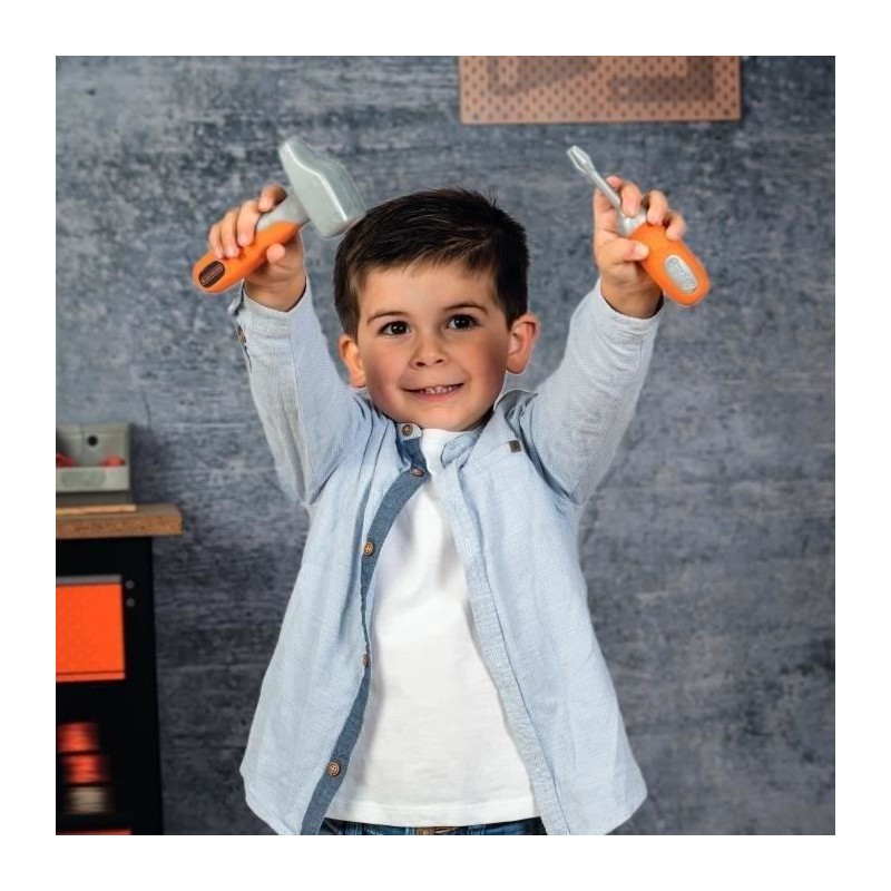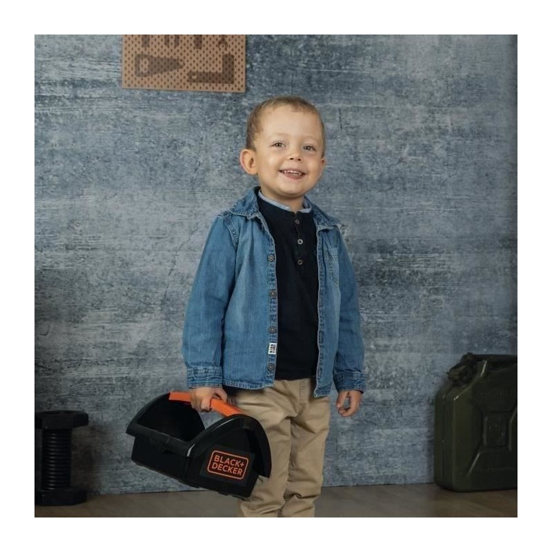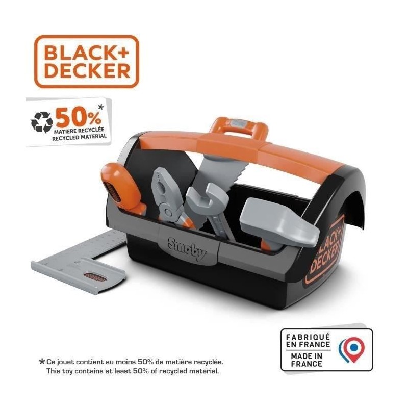 Bricole comme papa et maman avec ta superbe boite a outils Black + Decker !_x000D_ _x000D_ Tu as a ta disposition tous les outils nécessaires pour t'initier au bricolage : 1 tournevis, 1 scie, 1 marteau, 1 clé plate, 1 équerre et 1 pince._x000D_ _x000D_ Pratique, tu pourras la transporter facilement et partout avec toi grâce a sa poignée !_x000D_ _x000D_ _x000D_ Pour les enfants a partir de 3 ans. Made in France.