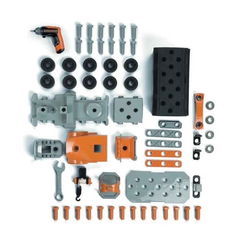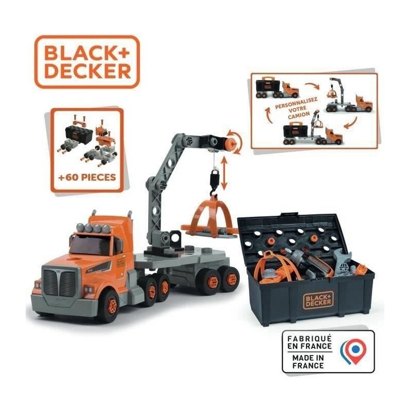 Tu ne t'ennuieras plus grâce au camion Black + Decker qui offre de nombreuses possibilités de jeu !_x000D_ _x000D_ Il propose de nombreux scénarios de construction, notamment la création de sa propre grue grâce aux accessoires inclus : regles de construction, vis, écrous, roues, éléments emboitables, clé plate, meme une visseuse mécanique... 60 accessoires t'attendent !_x000D_ _x000D_ A la fin du jeu tu n'auras qu'a tout ranger dans la remorque : en effet celle-ci fait aussi office de boîte a outils. En plus tu pourras la transporter n'importe où grâce a sa poignée de transport !_x000D_ _x000D_ Tres complet, le camion Black + Decker saura t'amuser pendant de longues heures !_x000D_ _x000D_ A partir de 3 ans.