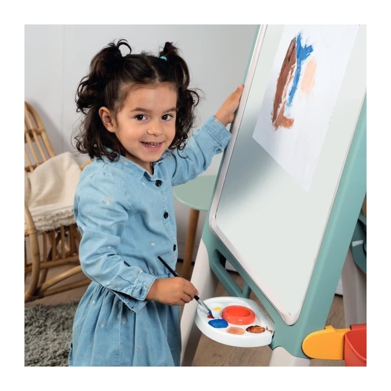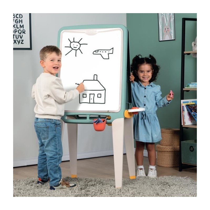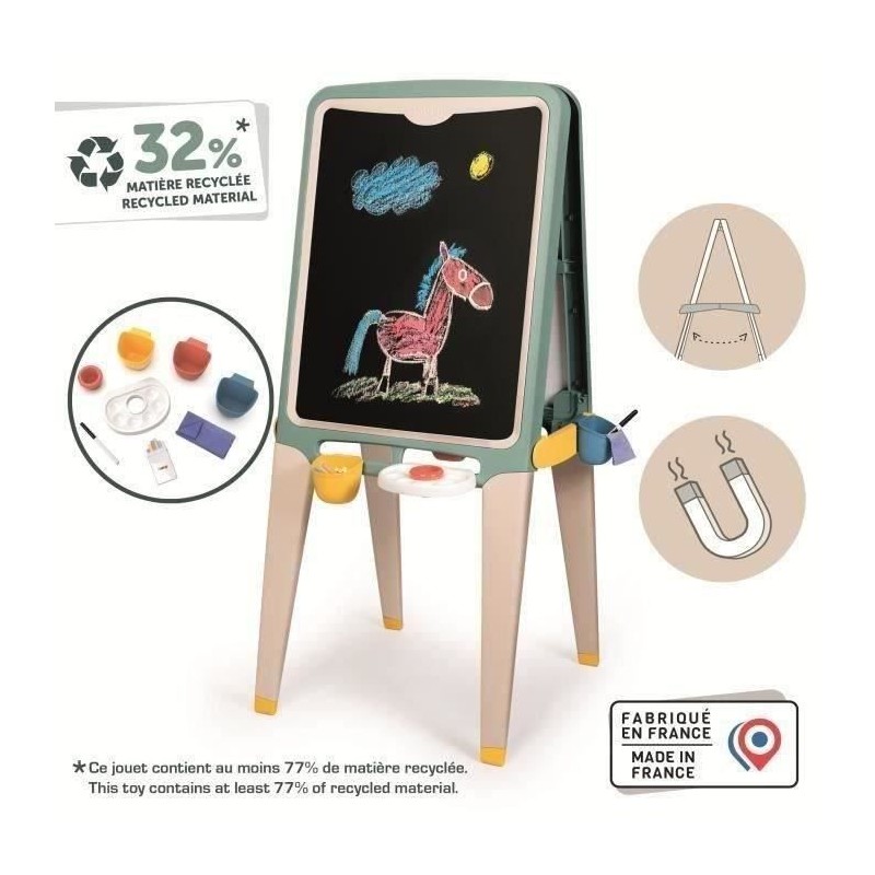 Le Grand Tableau Smoby offre de nombreuses possibilités de jeu grâce a ses deux différentes faces : une face craie et une face blanche magnétique. _x000D_ _x000D_ Vos enfants pourront ainsi inviter leurs amis a partager leur tableau et s'amuser ensemble !_x000D_ _x000D_ Ils apprendront a dessiner, a écrire et meme a peindre grâce a ce tableau plastique stable et résistant. _x000D_ _x000D_ Ils pourront également accrocher leurs oeuvres d'arts grâce au pince-feuille intégré. _x000D_ _x000D_ Solide et stable, il se range aussi rapidement grâce a un pliage facile. _x000D_ _x000D_ 13 accessoires inclus : 1 feutre effaçable, 6 craies de couleur, 3 bacs de rangement, 1 palette pour peindre et 1 chiffonnette. _x000D_ _x000D_ A partir de 3 ans - Fabrication française, a partir de plastique recyclé. _x000D_