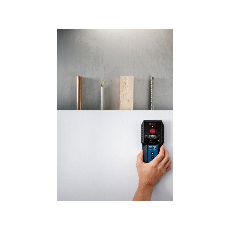 Points forts du produit Quand vous percez dans un mur, vous voulez etre sûr de ne pas rencontrer d'obstacles. Le scanner mural GMS 120-27 Professional permet de détecter des objets facilement et de maniere intuitive. Les résultats de détection sont indiqués par un signal sur l'écran et par la bague tricolore entourant le trou de marquage. Ce détecteur facile a utiliser permet de sélectionner facilement le mode de détection et de marquer l'endroit précis où des objets ont été détectés grâce au trou de marquage. Protégé contre la poussiere et les projections d'eau (indice IP54) et doté d'un boîtier caoutchouté absorbant les chocs, le robuste détecteur GMS 120-27 a été conçu pour les environnements de chantiers les plus rudes. Équipement et application Le scanner mural GMS 120-27 Professional détecte et localise les objets en métal, les fils électriques sous tension et les ossatures en bois dans les cloisons seches. Le fait d'utiliser un détecteur avant de percer pour vérifier s'il n'y a pas d'objets enfouis dans les murs accroît la sécurité, tout particulierement lors de travaux de rénovation lorsqu'il s'agit de fixer des placards, des plans de travail de cuisine, des lavabos, des chauffe-eau et des systemes de chauffage ou bien d'installer des climatiseurs ou extincteurs automatiques a eau. Informations complémentaires Ce scanner ne fait pas que localiser le centre de l'objet détecté, il indique aussi la nature et la constitution de l'objet : métal magnétique ou non magnétique, câble électrique sous tension. Données les plus importantes Technologie radar Bosch Non Objets détectables Métaux magnétiques (p. ex. fer), Métaux amagnétiques (p. ex. cuivre), Câbles électriques sous tension, Ossatures en bois Profondeur de détection maxi. 120 mm Profondeur de détection maxi, métal magnétique 100 mm Profondeur de détection maxi, métal non-magnétique 120 mm Profondeur de détection maxi, câbles sous tension 50 mm Profondeur de détection maxi, structures en