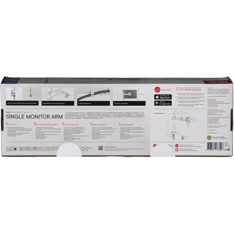 Apportez élégance et praticité a votre poste de travail avec ce support Smart simple bras en blanc. Compatible avec les écrans de 13 a 32 pouces jusqu'a 8 kg, VESA 100. Ajustez hauteur, rotation, orientation et inclinaison selon vos besoins. Parfait pour les moniteurs incurvés, il inclut une gestion de câbles discrete et deux méthodes de fixation au choix. Garantie 10 ans pour une tranquillité assurée.