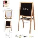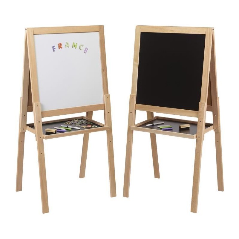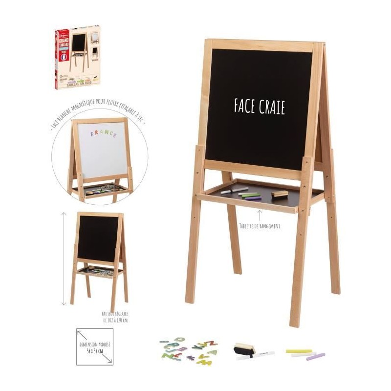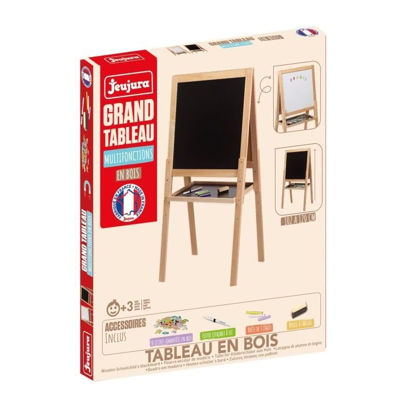 Découvrez le grand tableau multifonctions en bois JEUJURA, idéal pour les enfants a partir de 3 ans. Il comprend une ardoise pour craie, une ardoise blanche magnétique, une tablette et des pieds ajustables. Dimensions : 54 x 54 cm.
