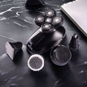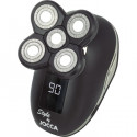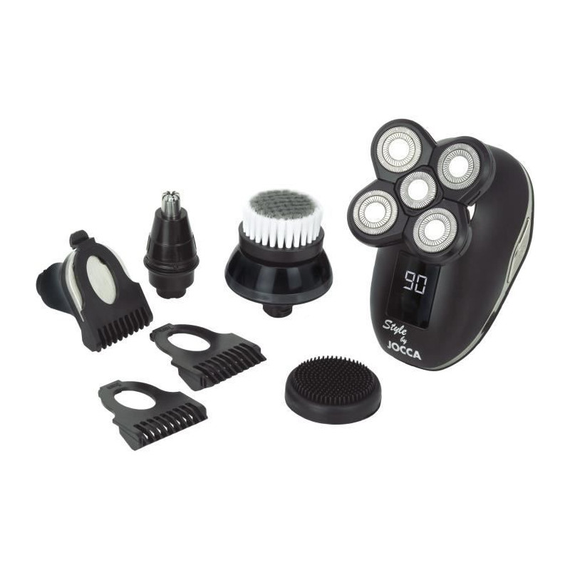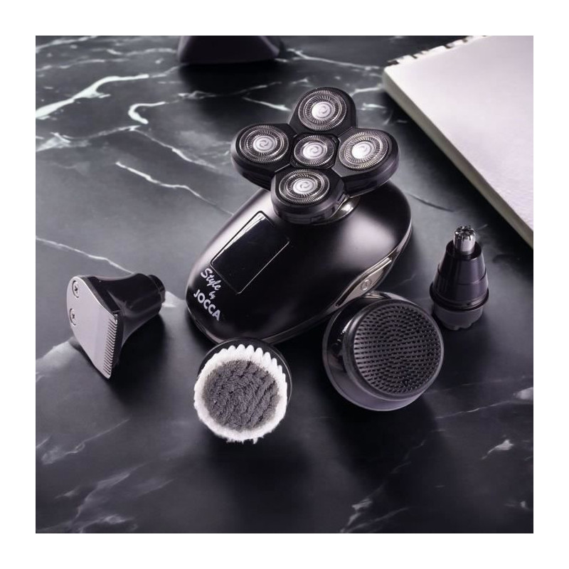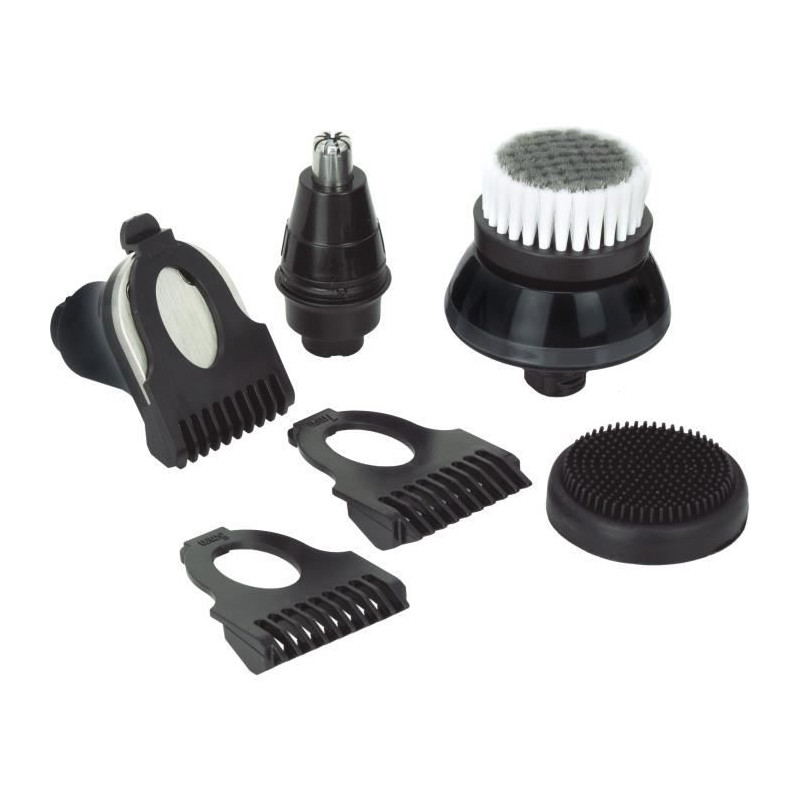 Idéal pour la barbe, la moustache, le cou et les pattes. 5 tetes interchangeables. Rasoir a tetes rotatives. Tondeuse nez et oreilles. Brosse nettoyante visage. Brosse de massage. Tondeuse a barbe. 3 guides de coupe de 3,5 et 7 mm. Lames en acier. Écran LED. Câble de charge USB. Bouton ON/OFF. CC : 3.7V · Batterie lithium-polymere 600 mAh. Charge : 5V = 1A. Autonomie : 1h